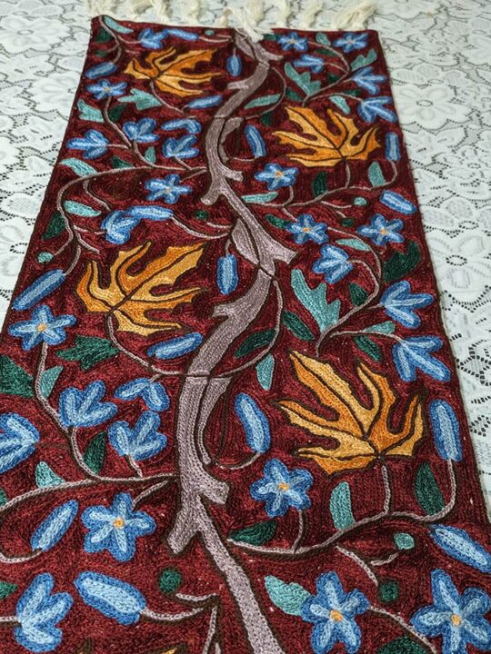 This is a beautiful chain stitch runner rug. This runner is made in Kashmir India. The fabric is Kashmiri Dusoot cotton and embroidery is done by pure silk thread.