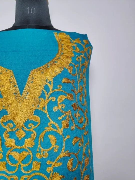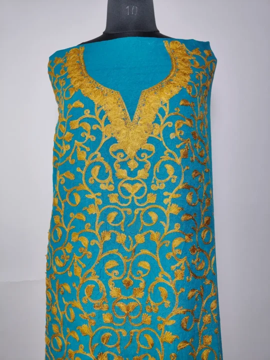 There’s a soft rhythm in how the badami jaal pattern flows all over this blue 2pc suit. Crafted in crush cotton with aari embroidery, this traditional kashmiri suit piece comes unstitched as salwar and kameez, giving it both comfort and personal styling flexibility.