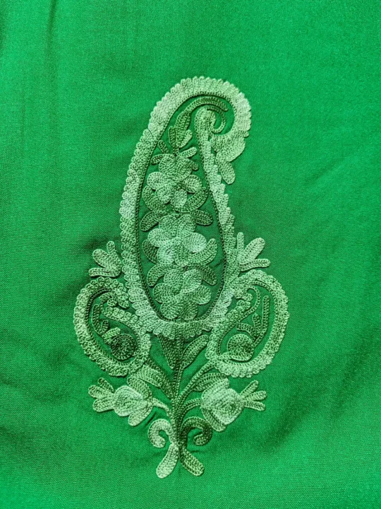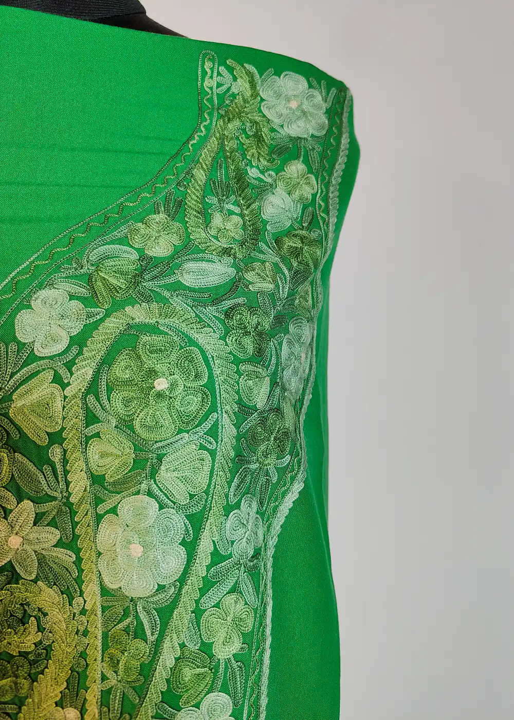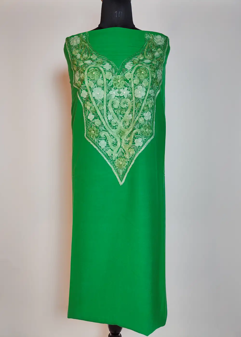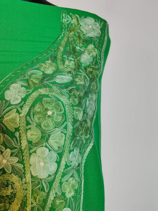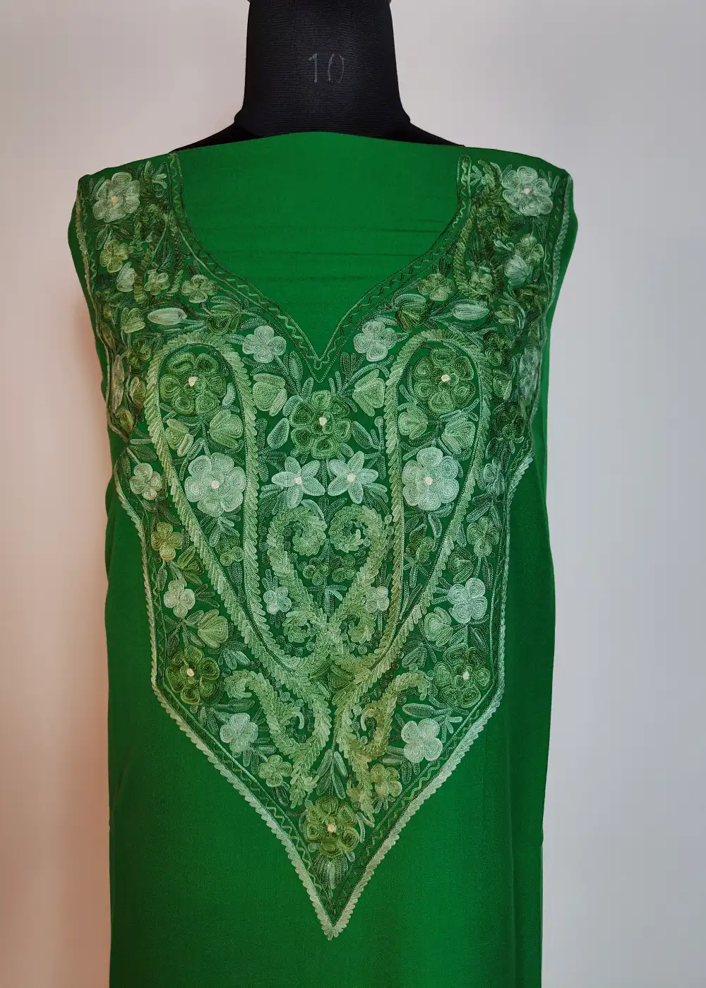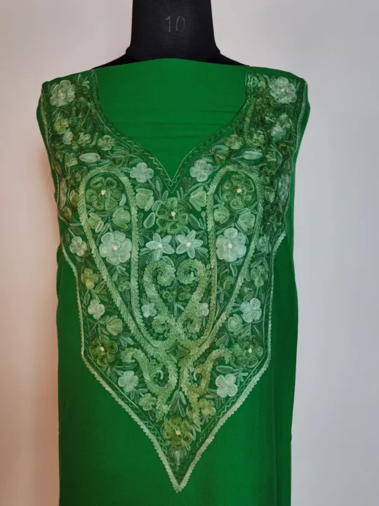 This Kashmiri designer suit focuses on detailed badam, floral neckline aari embroidery. The fabric is comfortable for daily summer wear. A nice option within Kashmiri suits for summer, offered unstitched for your own customization.
