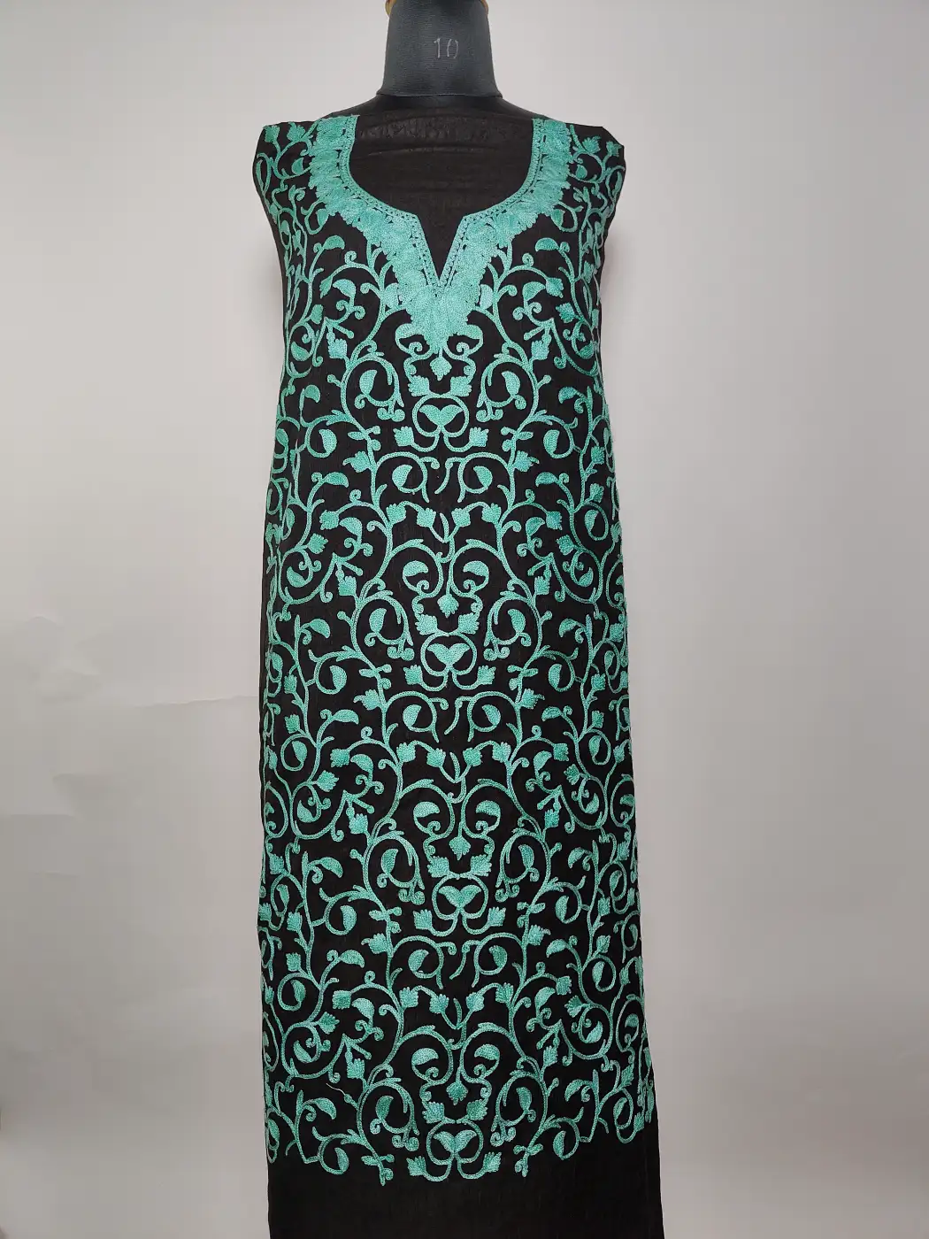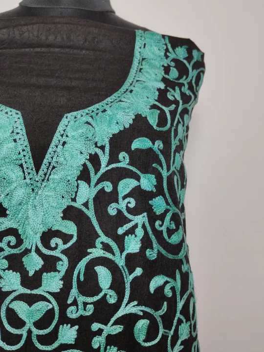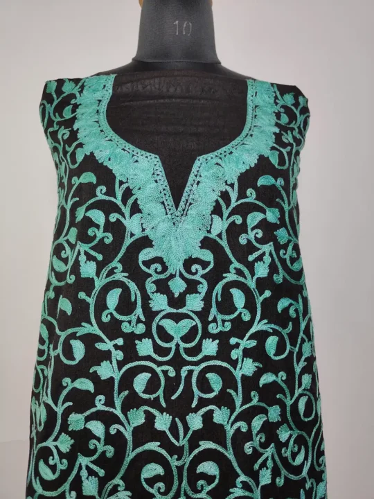 This black colour 2pc kashmiri suit set carries a graceful badami jaal pattern embroidered all over in aari work. This black crush cotton base feels light and easy. With unstitched salwar and kameez included, it offers a blend of comfort and personal tailoring freedom.