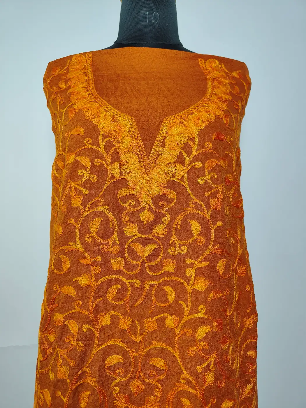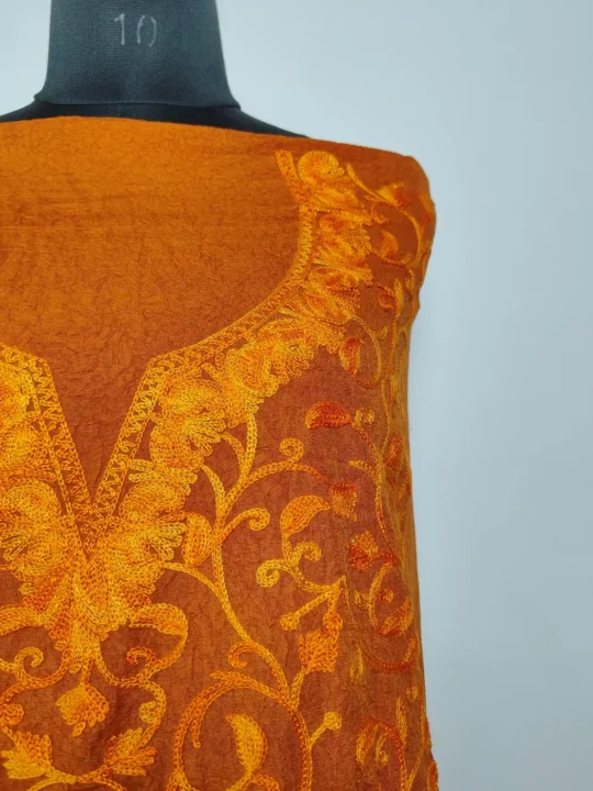 Aari embroidery in a full jaal badami pattern covers this orange shade crush cotton design evenly. This kashmiri kadai suits comes unstitched with salwar and kameez, giving you the ease to customise while enjoying a detailed and traditional overall look.