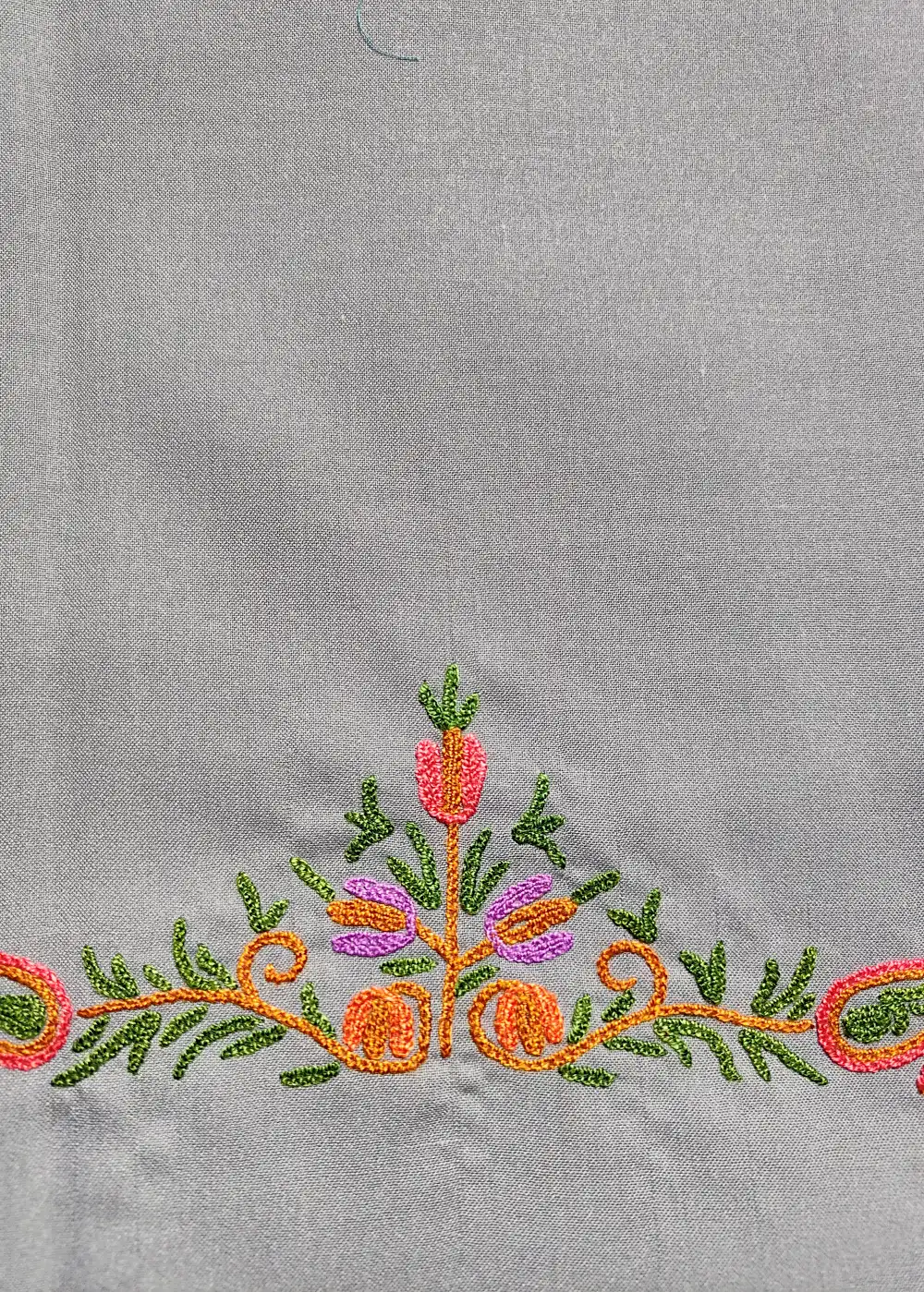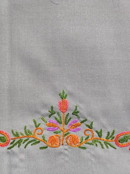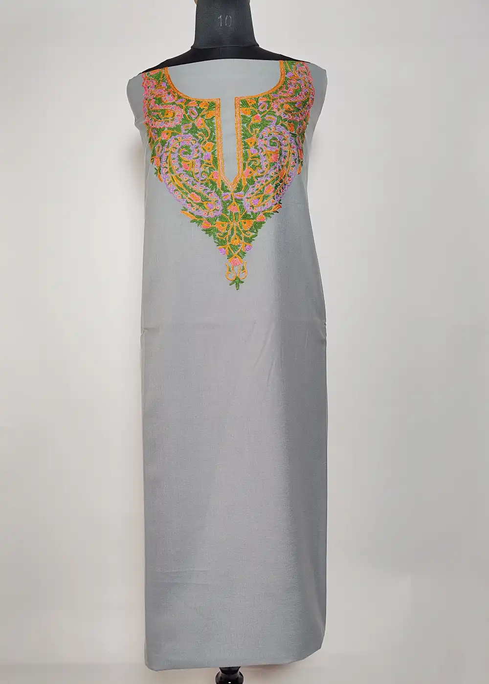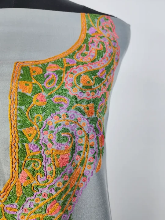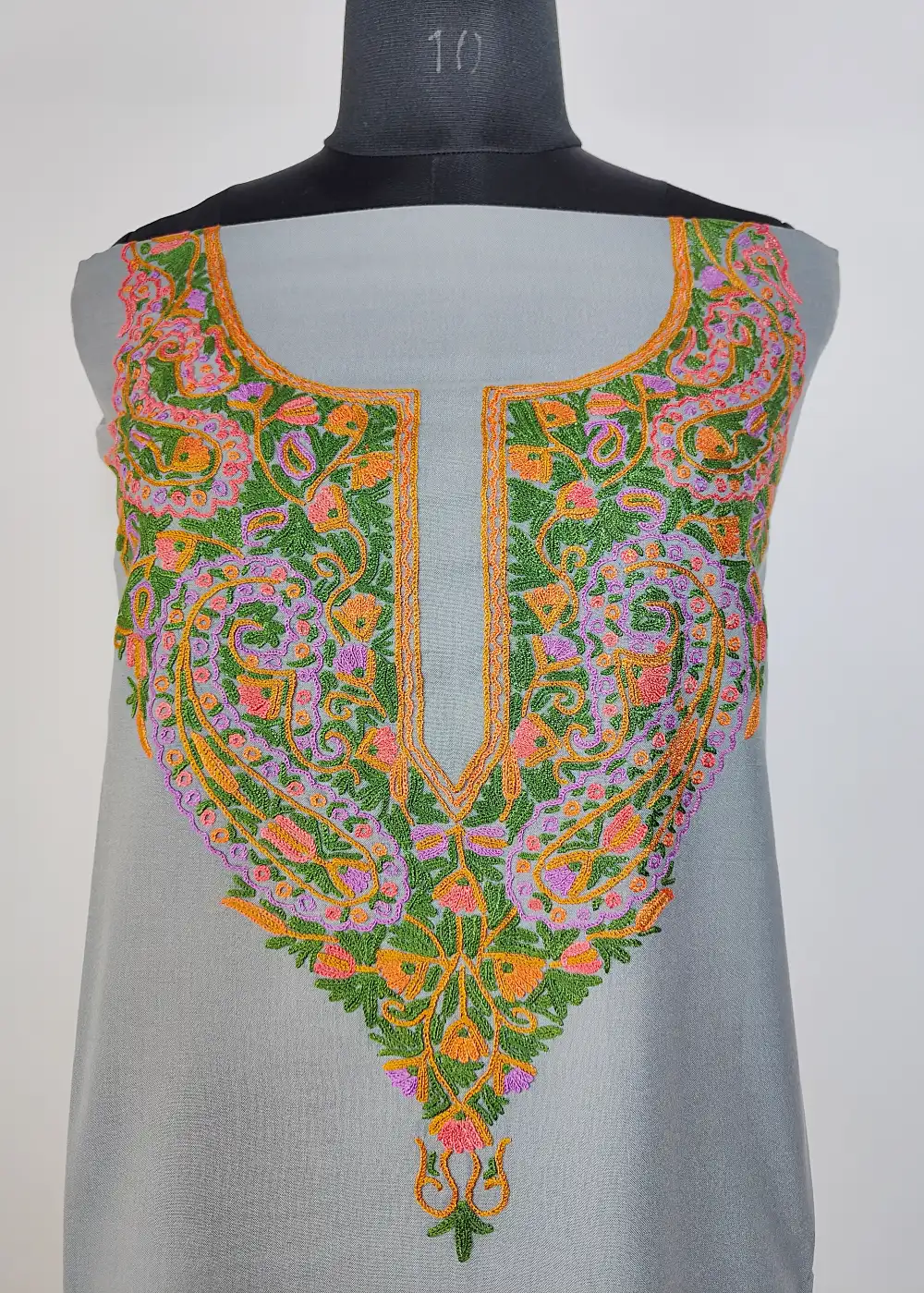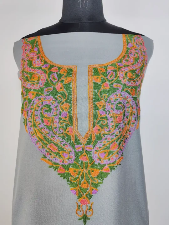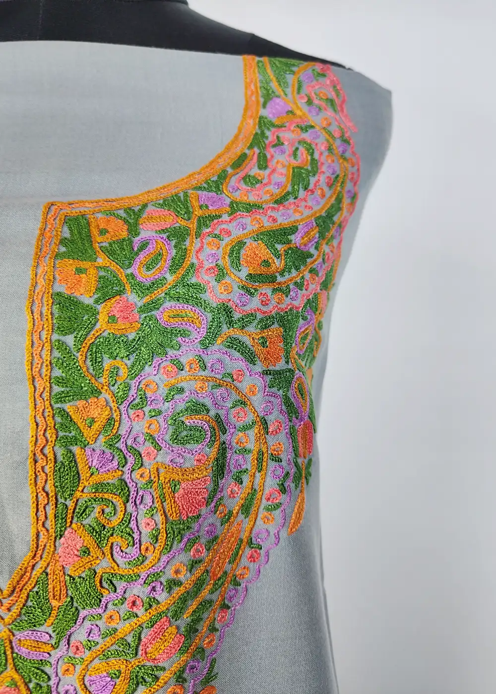 This Kashmiri suit set in summer cool cotton comes with beautiful small badam and floral hand Aari jadhai motifs around the neckline, giving it a classic traditional finish. A great choice among Kashmiri suits for summer, provided unstitched for customized fitting.