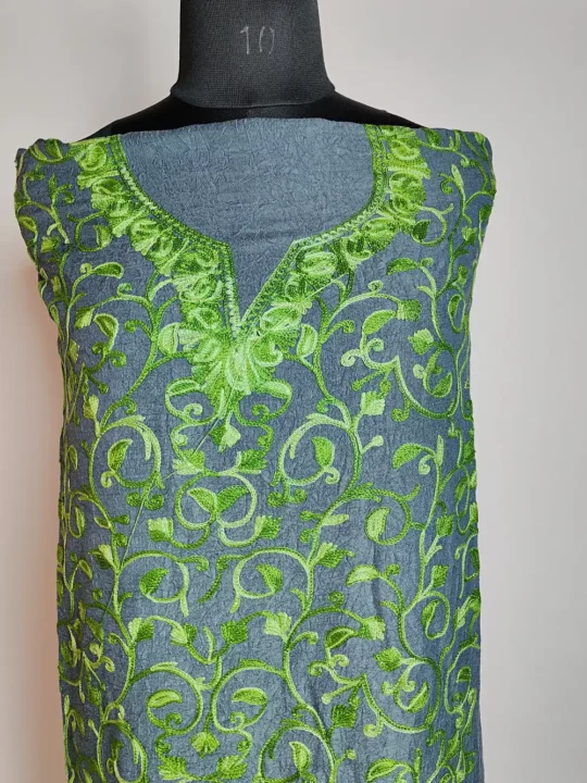 This Grey salwar kameez suit in crush cotton features detailed badaam jaal aari work all over with elegant kadhai highlighting the neckline. The cotton fabric feels soft and breathable for warm days. It is offered unstitched so you can stitch it in your own style.