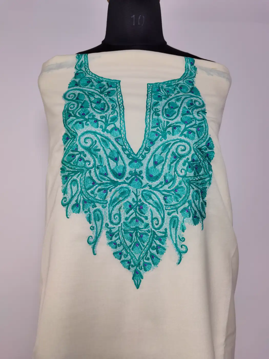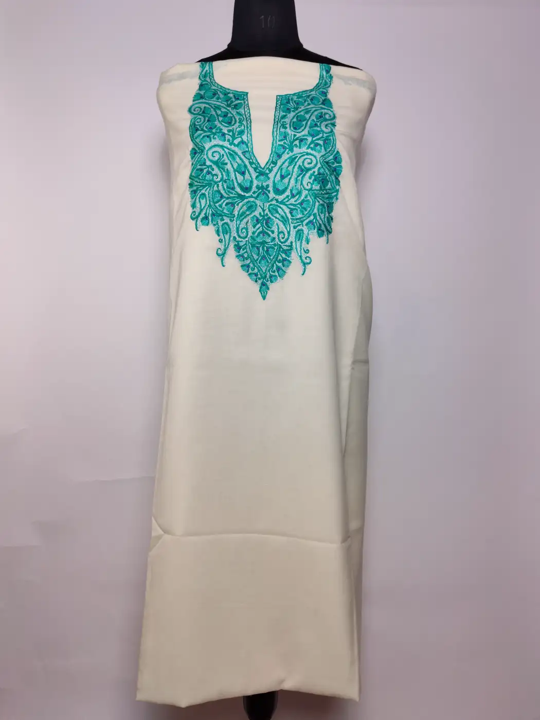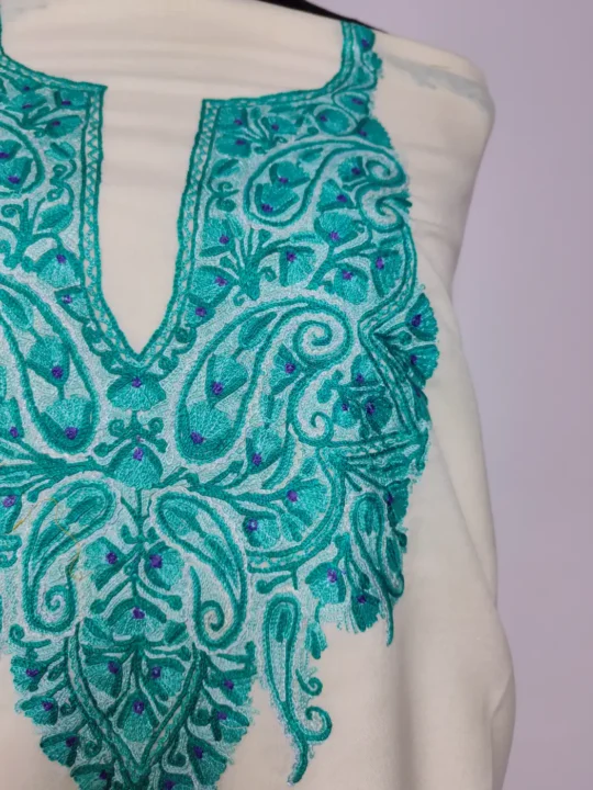 White summer cool cotton fabric shapes this Kashmiri decent suit. It is made for ladies. It is adorned with hand aari embroidery. The neckline carries floral motifs. This 2pc Kashmiri dress is unstitched for custom fitting.