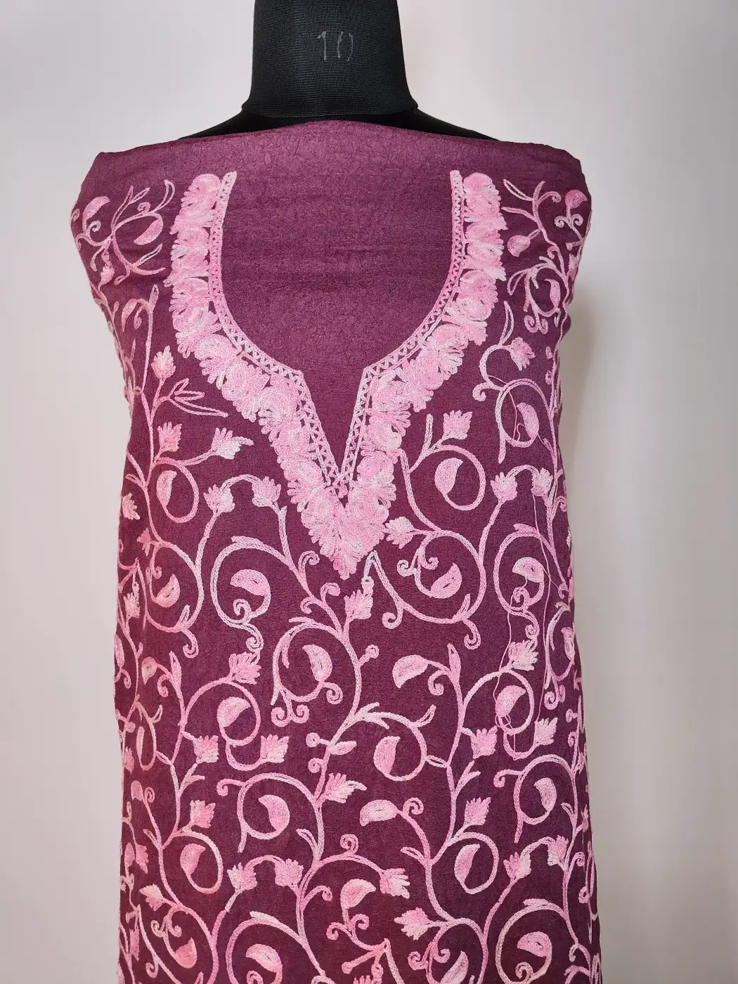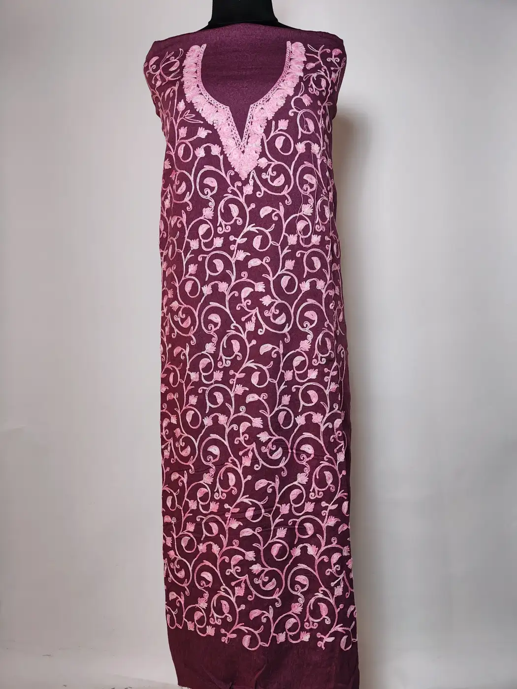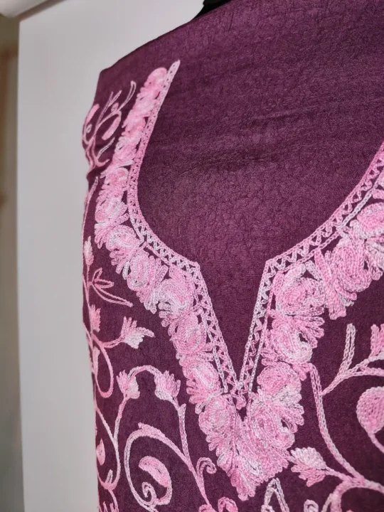 Crafted in magenta crush cotton, this suit delivers Kashmiri sophistication with unstitched kurti and trouser suited for custom fits. It has floral aari embroidery which adorns the neckline and front panel with jaal style work.