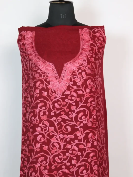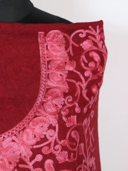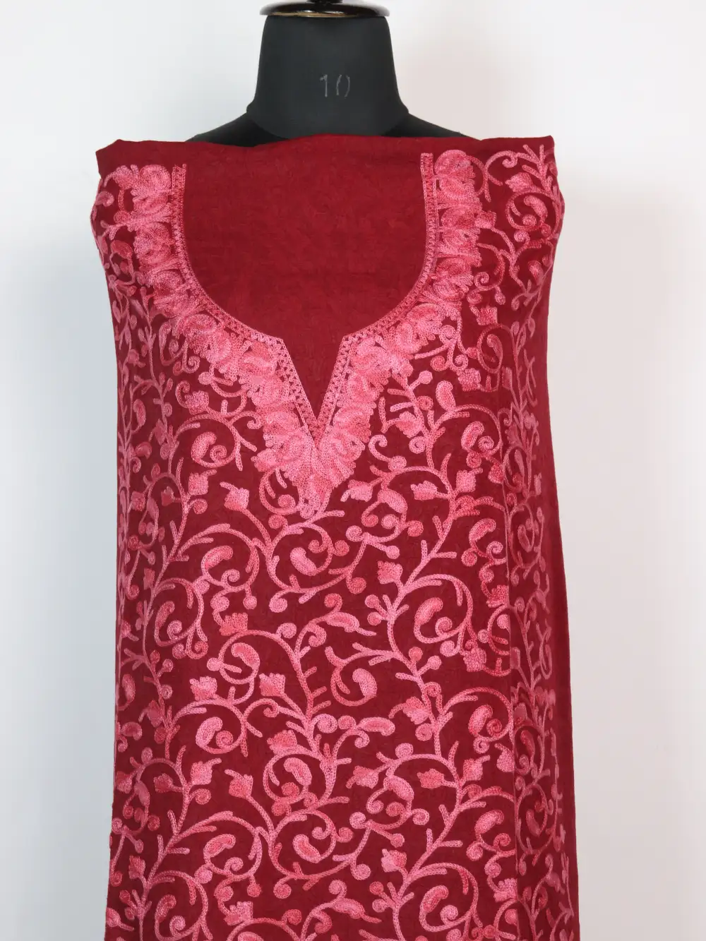 Crush cotton piece in maroon carries Aari embroidery in vine floral and badam motifs across this unstitched 2pc Suit with red-pink hue threads. Its neckline is subtly defined but the jaal pattern remains the central theme, which is flowing acrossit. Because the fabric is unstitched you may stitch it to the exact chest and length you prefer; the kapda is light and comfortable for warm weather. It is a strong option for shoppers seeking Kashmiri kadhai suits.