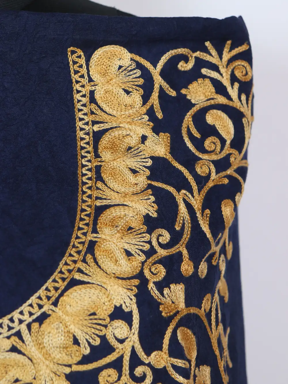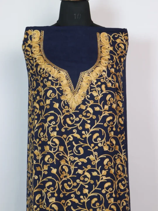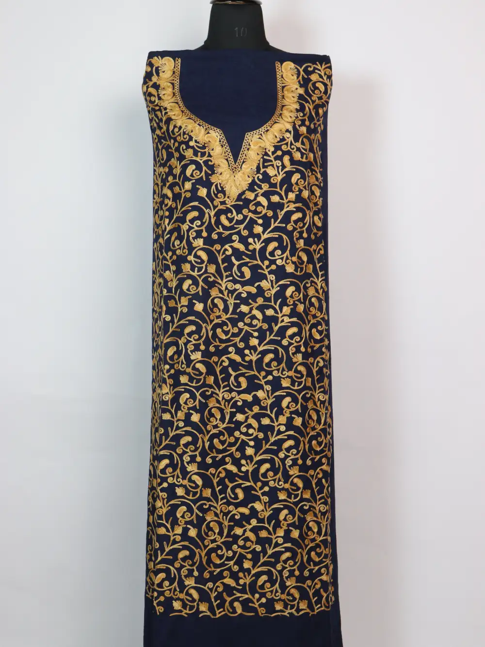 Crush cotton piece in dark blue carries jaal Aari embroidery in floral and badam motifs across this unstitched 2pc Suit with mustard hue threads. Its neckline is subtly defined but the jaal pattern remains the central theme, which is flowing across it. Because the fabric is unstitched, you may stitch it to the exact chest and length you prefer; the kapda is light and comfortable for warm weather. It is a strong option for shoppers seeking salwar kameez material.