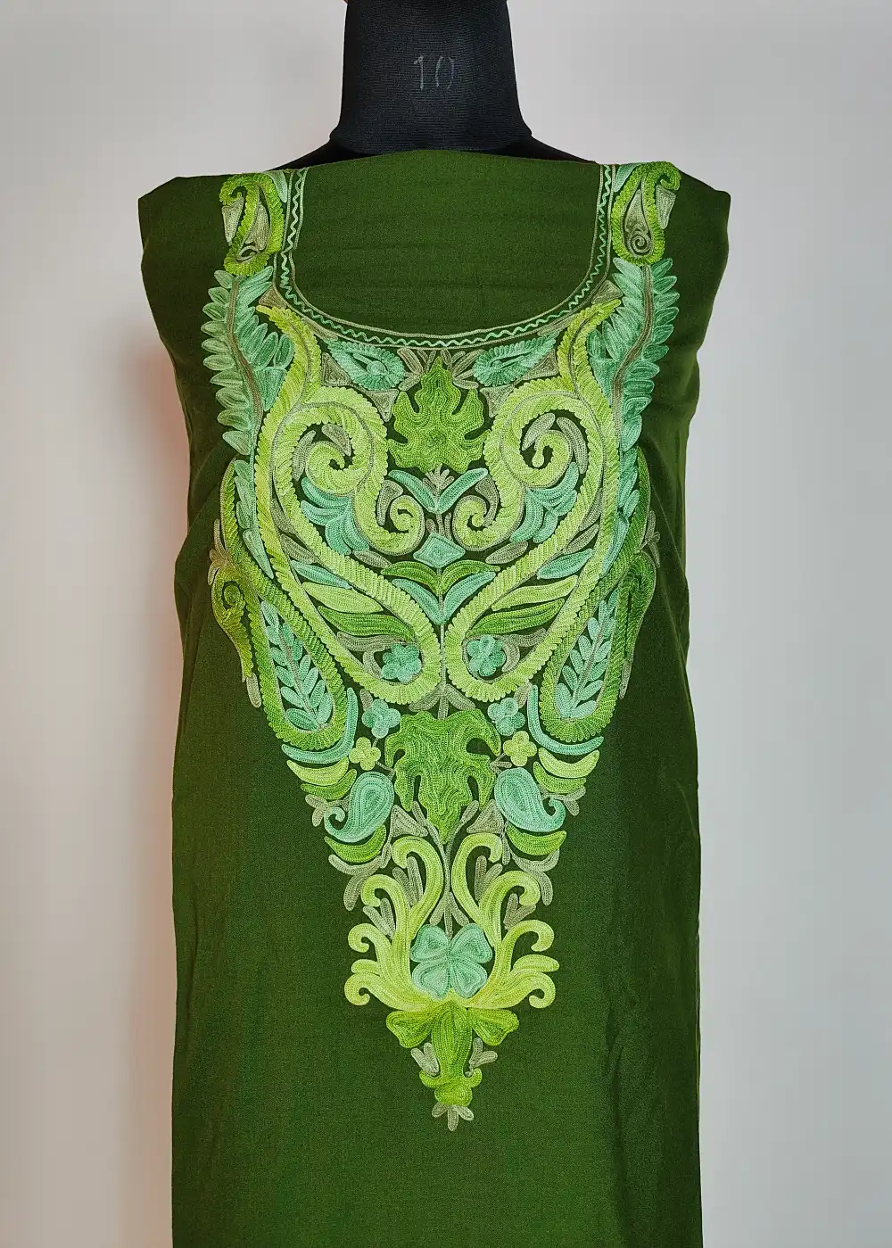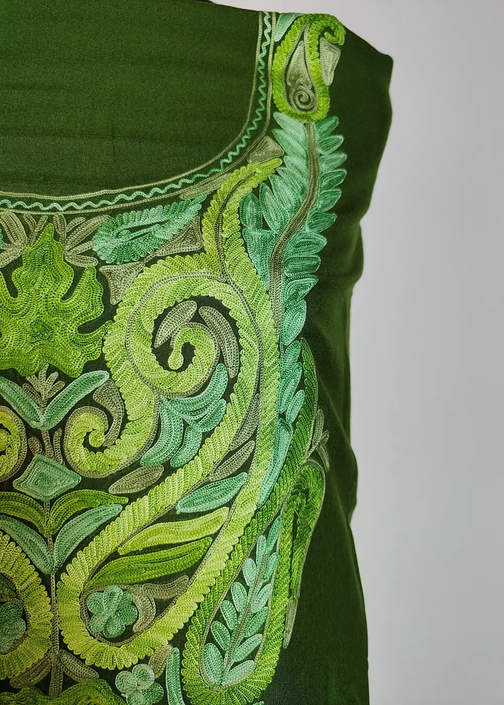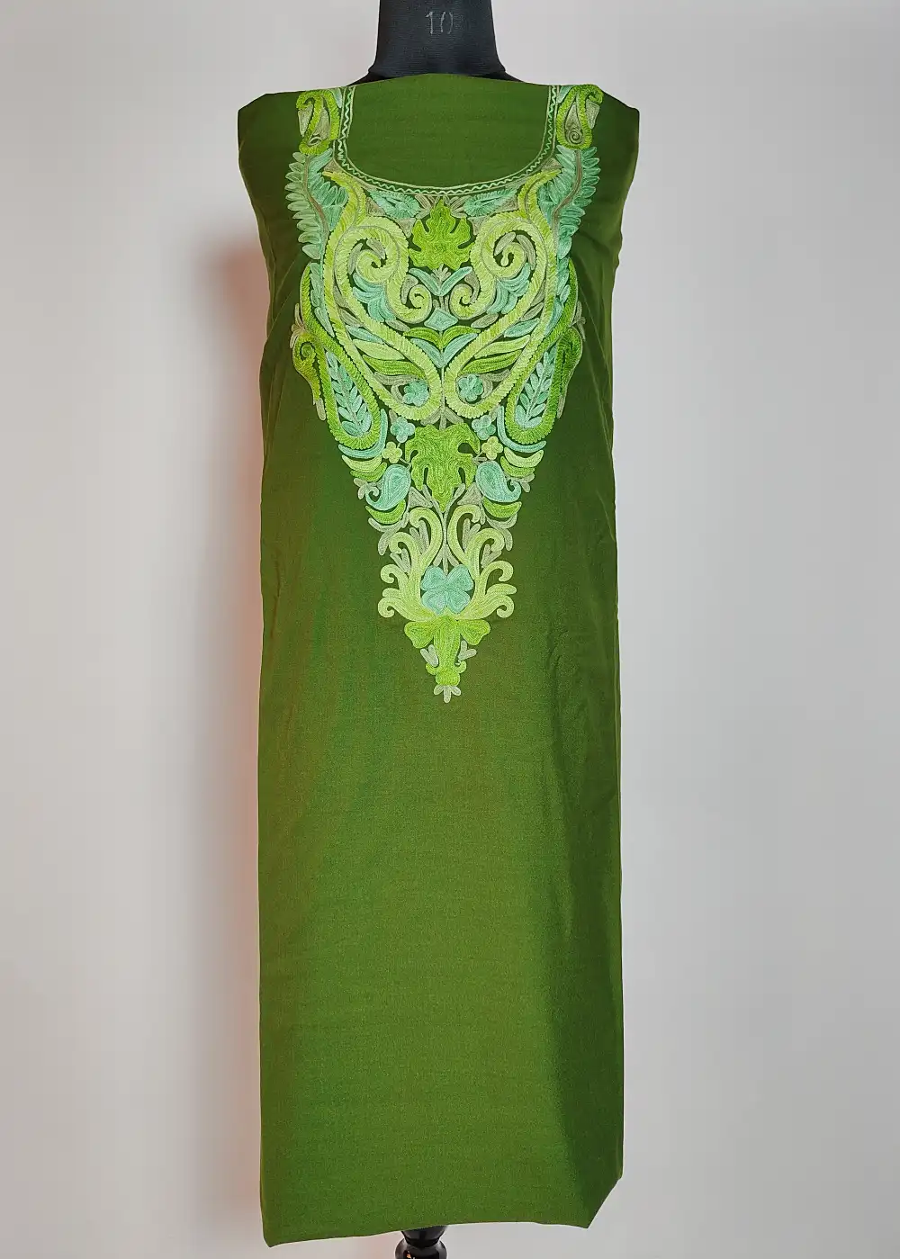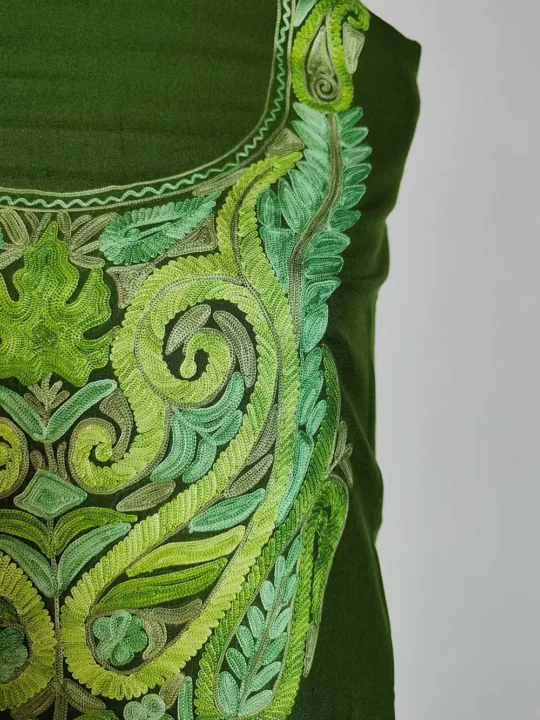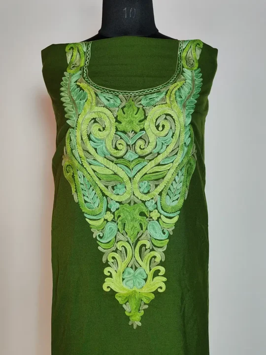 This Kashmiri unstitched suit style 2pc summer cool cotton fabric has detailed chinar posh bagh Aari embroidery done around the neckline that gives it a classic traditional touch. The fabric feels light and comfortable for warm days. It is offered unstitched so you can stitch it to your own fitting and style.