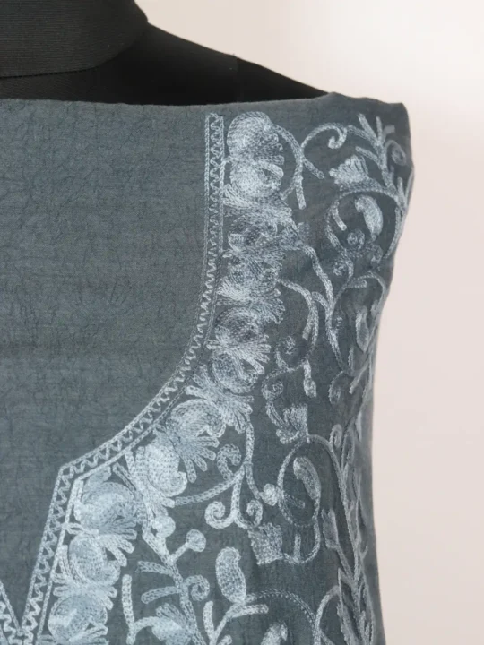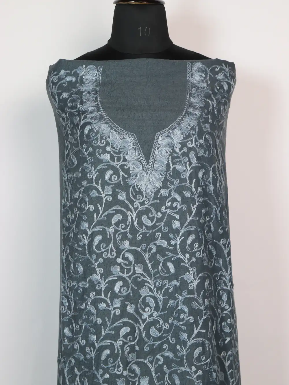 Lightweight crush cotton in classic grey hue forms the base for all-over dark grey jaal Aari vine floral and badam embroidery on this unstitched 2pc Suit. This jaal work spreads across the whole body. Being unstitched, the 2pc Suit lets you set preferred fitting and proportions, which makes it practical for summer wardrobes and for those who prefer buy cotton suits online and stitch locally.