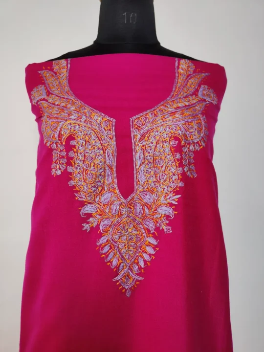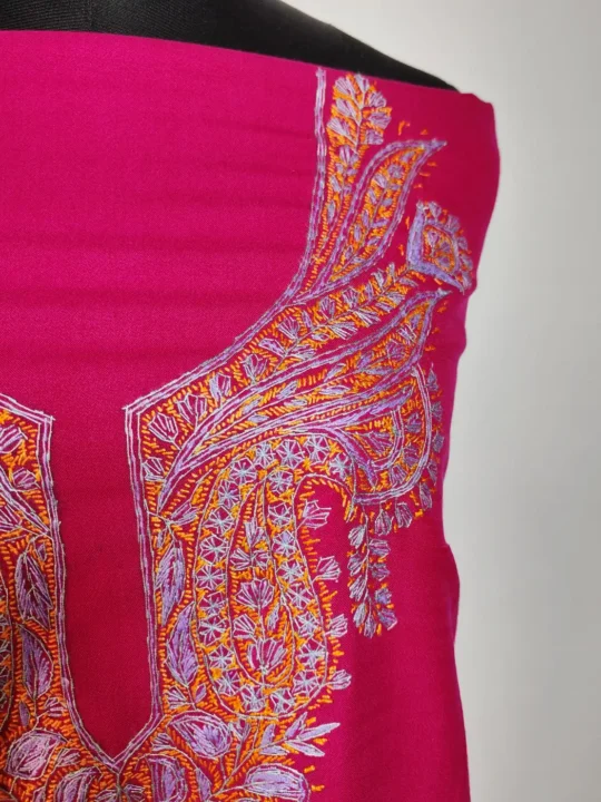 Sozni embroidery forms delicate badam motifs across the neckline of this magenta colour Kashmiri work suit by hand, which adds a handcrafted Kashmiri elegance to this comfortable two-piece ensemble. It has been designed in soft summer cool cotton fabric which comes as an unstitched kurti and trouser so it can be tailored to your personal fit.