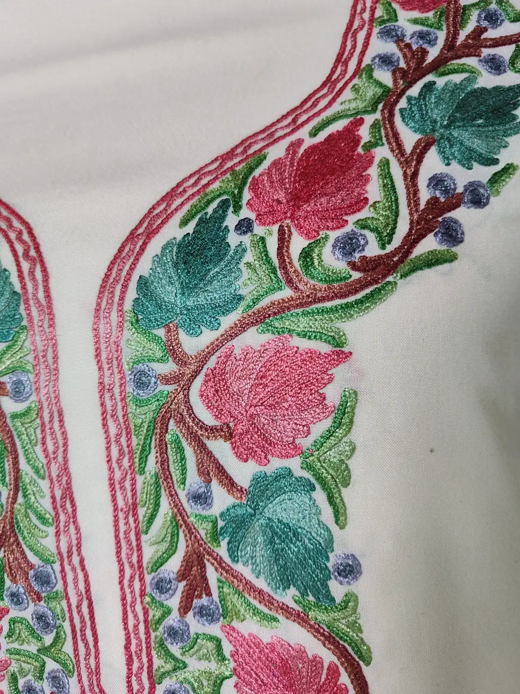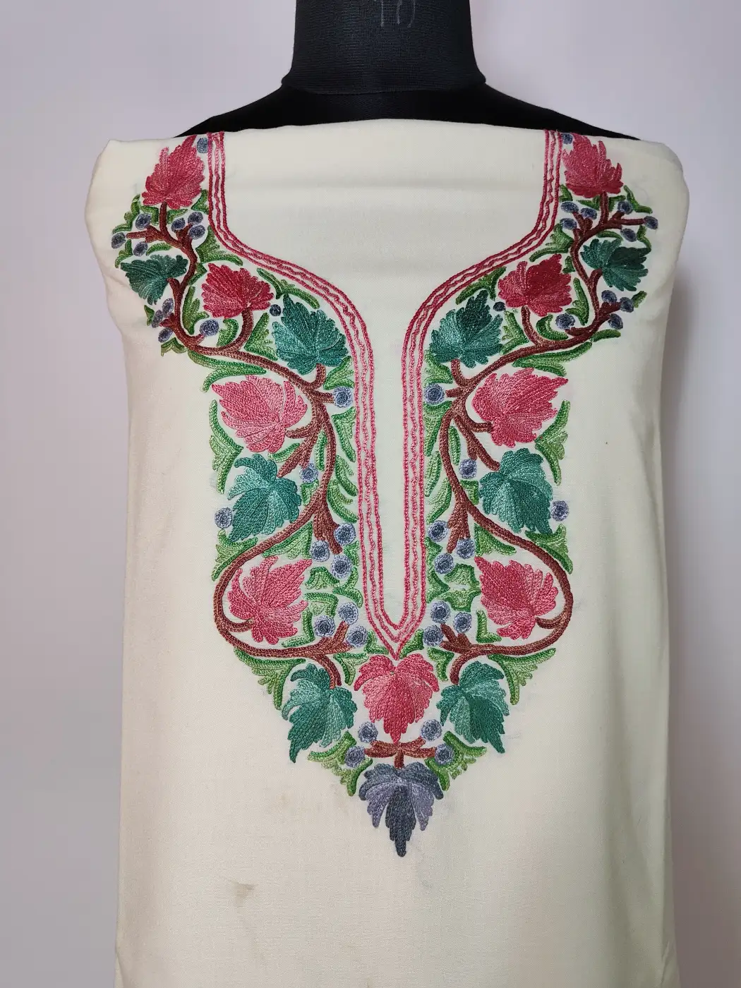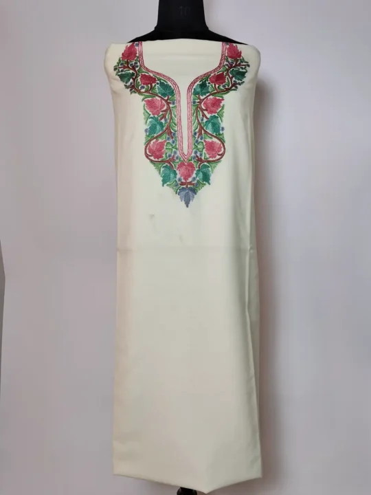 Finished in cream summer cool cotton, this suit embodies Kashmiri refinement through unstitched kurti and trouser for tailored comfort. It features floral aari embroidery highlights the neckline beautifully.