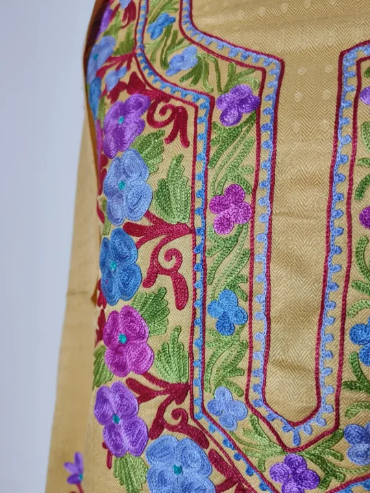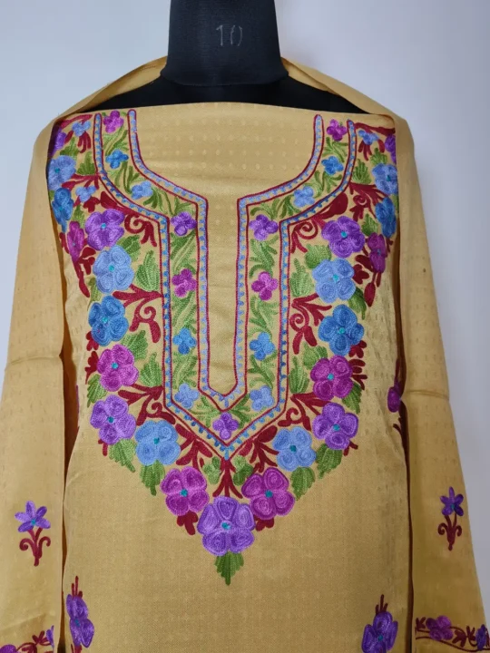 A brown colour 3pc dress material for suit in cashmilon wool fabric features aari embroidery at the neckline in floral motifs and on the front panel in booti style pattern. And it comes as a 3pc set that includes salwar, kameez and dupatta unstitched for custom fitting.