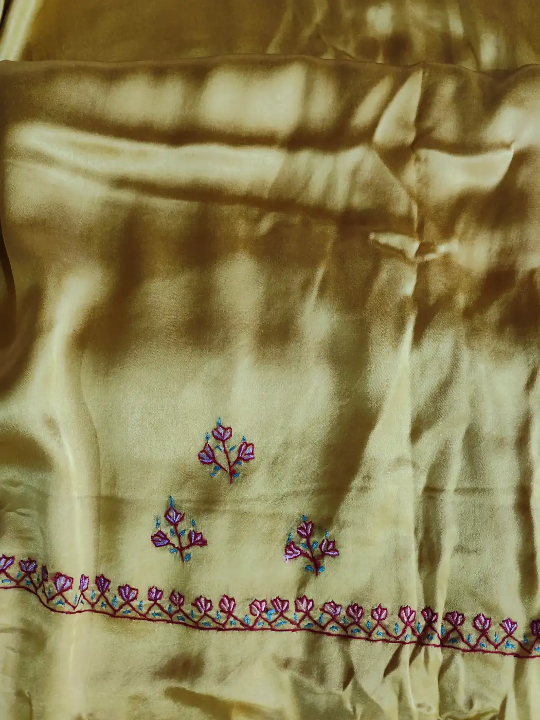 The richness of this kashmiri designer suit design comes from its floral embroidery which is done at neckline. Crafted in mustard modal silk and adorned with hand sozni work, it includes dupatta and unstitched salwar and kameez, which gives you the space to personalise the fit while keeping a traditional feel.
