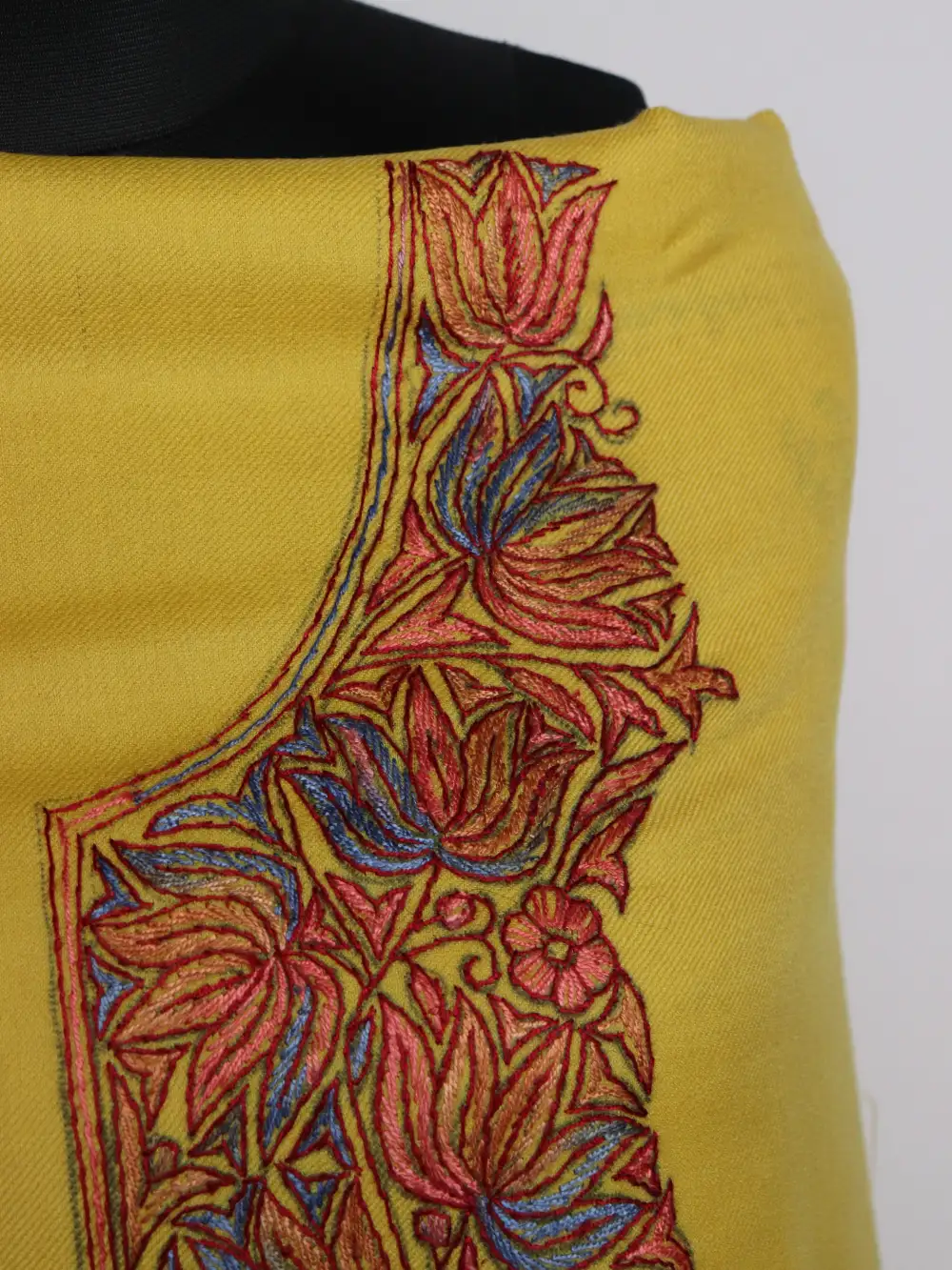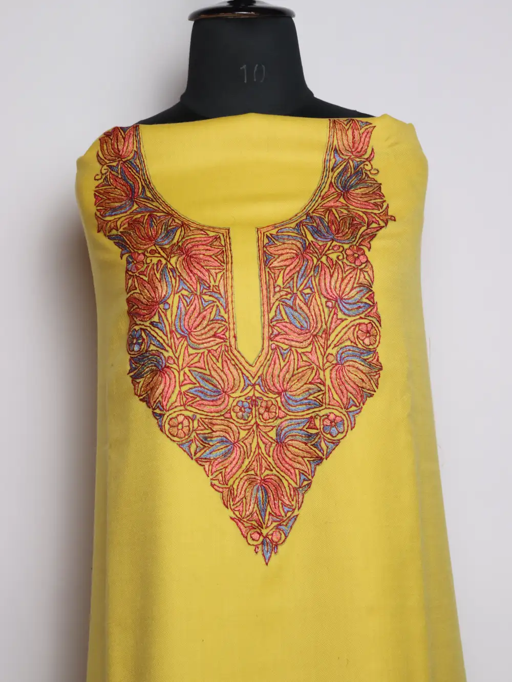 Crafted using polywool for seasonal warmth, this Kashmiri woolen suits for ladies appear in pastel yellow colour. This Kashmiri 3pc unstitched outfit includes kameez, salwar and dupatta. It showcase hand sozni and tilla floral neckline and all over booti embroidery.