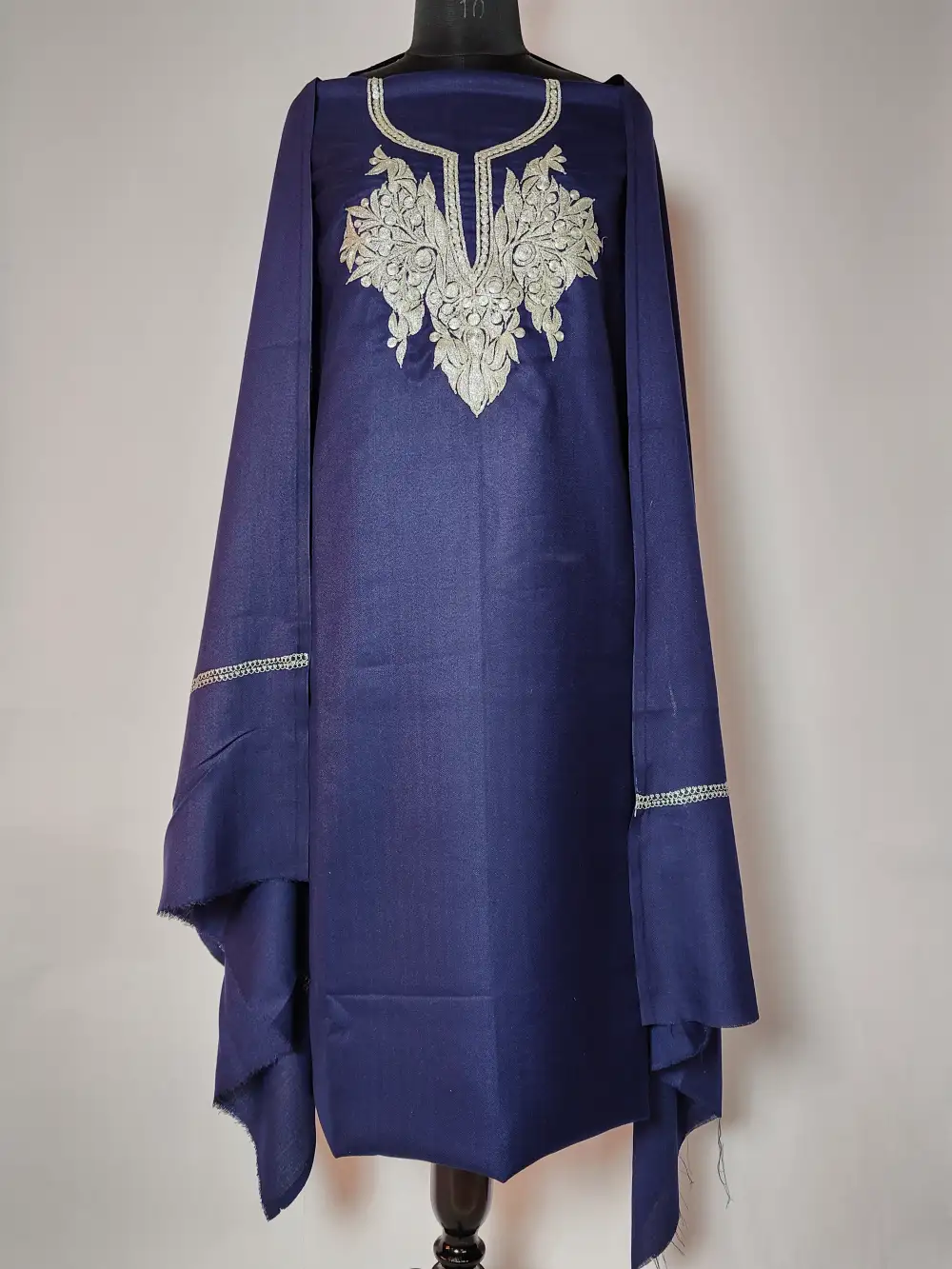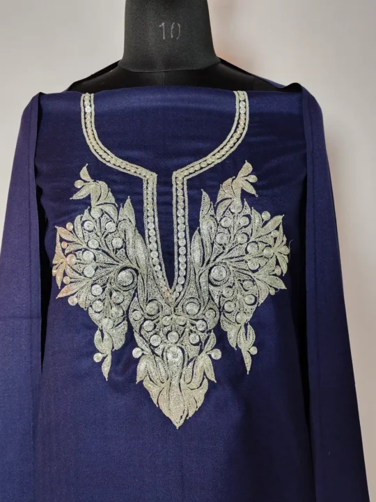 Acrowool salwar suit in dark blue features Botte Tilla embroidery at the neckline and arrives as a 3pc set — dupatta and salwar kameez unstitched, so you can stitch to your fit.