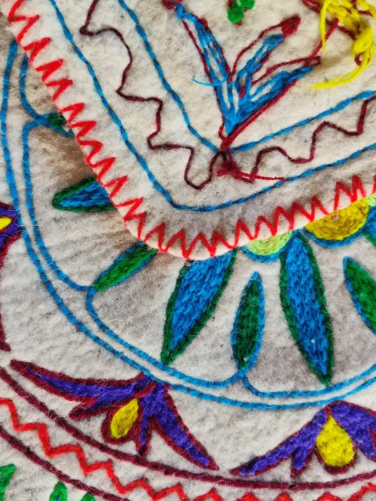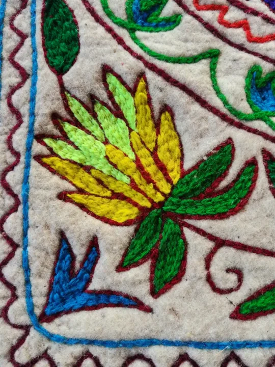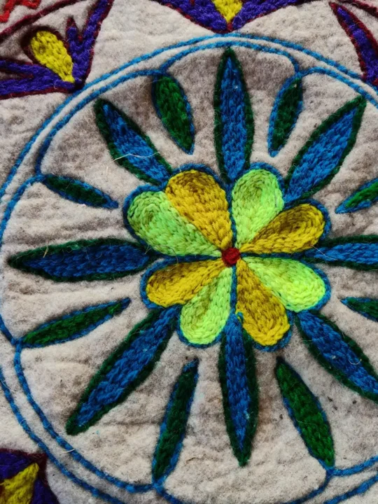 Bring the warmth of Kashmiri craftsmanship into your home with this 3×2 ft Namda, hand-embroidered using the traditional Aari technique. Crafted from pure wool, it offers natural insulation while adding a touch of artistry to your floors. It features floral pattern with blue petals and yellow floral center. This flower is encircled by a series of concentric circles, that features various patterns such as leaves, vines, and other floral motifs. The intricate patterns that also include mustard florals in corners, inspired by Kashmiri floral and vine motifs, makes it a beautiful blend of function and heritage. It has been made in Kashmir, this Namda isn’t just a floor covering—it’s a piece of cultural storytelling for your living space.