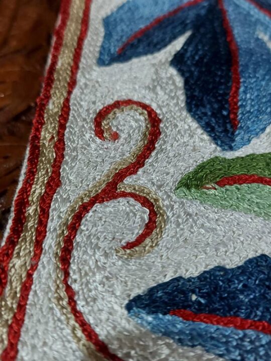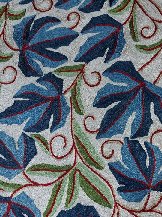 This is a beautiful chinar design chain stitch runner rug. This runner is made in Kashmir India. The fabric is Kashmiri Dusoot cotton and embroidery is done by pure silk thread.