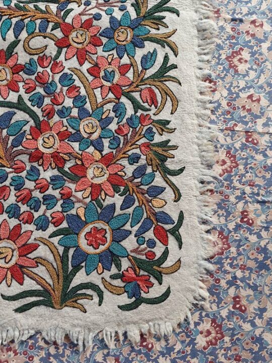 This beautiful white base Namda rug has dimensions 6ftx4ft. It is made of sheep wool and embroidery is done by hand on it. It features a floral design of Kashmir valley.