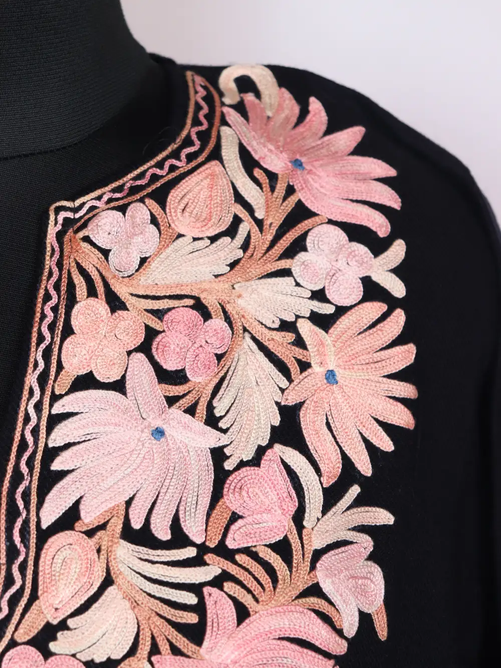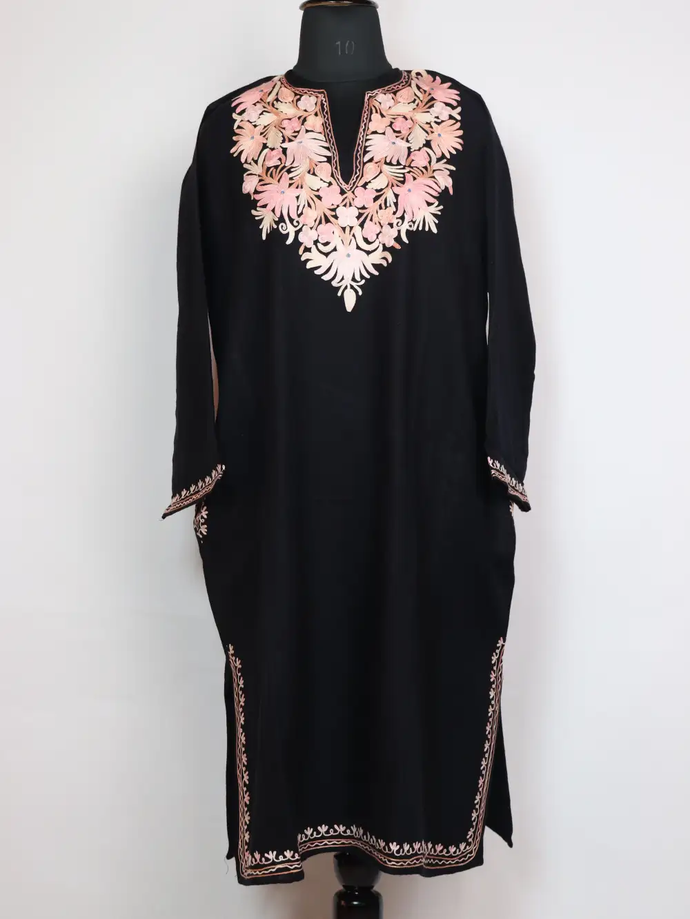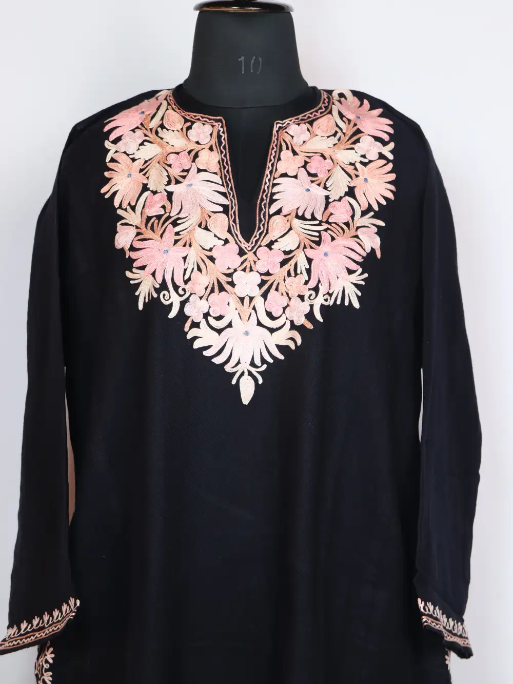 A black colour pheran crafted in Cashmilon Wool features Aari embroidery at the neckline in floral patterns and it includes pockets both the sides for handy use.
