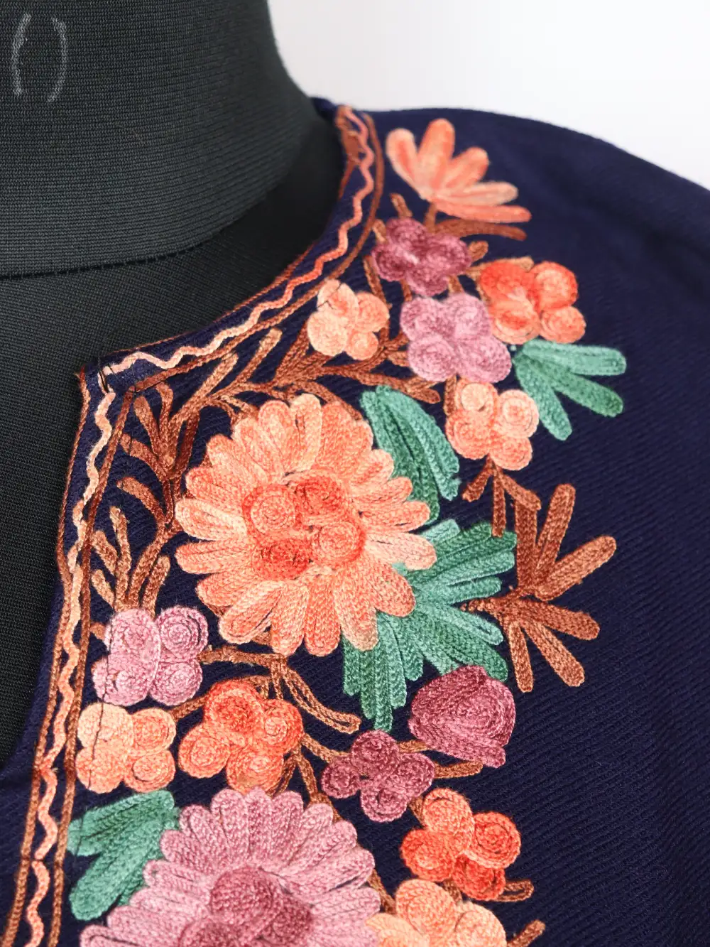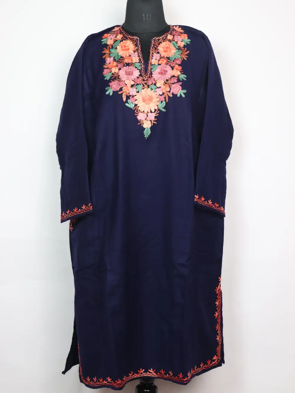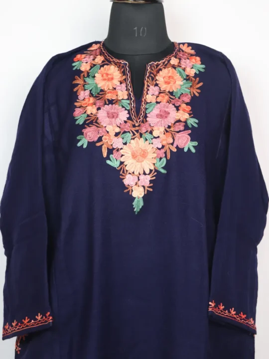 This indigo blue colour Kashmiri pheran made in cashmilon wool, offers refined comfort and a relaxed fall with its 52 inches chest size and 43.5 inches length. It is adorned with Aari work at neckline in floral motifs. It features pockets on both sides for convenience.