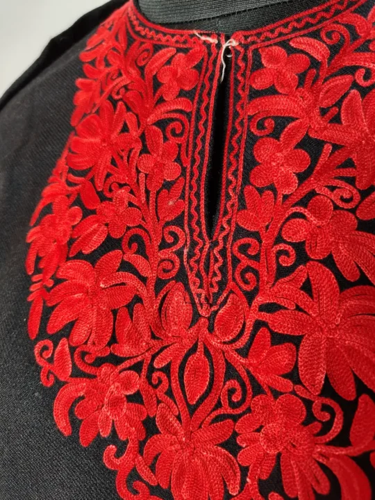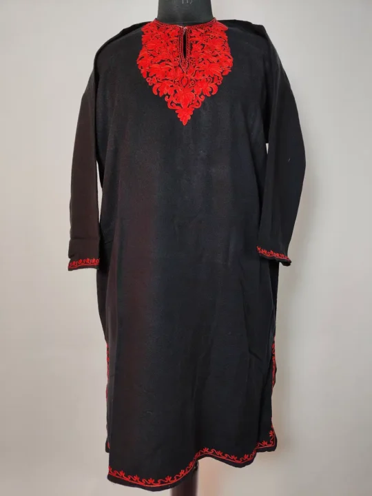 This black pheran in Cashmilon wool fabric features red floral embroidery along the neckline for a delicate accent. Its 40-inch length ensures a flattering fit, which makes it for casual winter styling. As it is priced at ₹1299, it’s an affordable choice that combines smooth comfort, cheerful colour, and a touch of craft-inspired beauty.