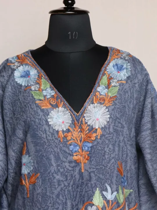 Wearing this kaftan feels like a break from the busy. The crushed cotton fabric keeps it airy and soft, and the Aari embroidery brings in a little Kashmiri artistry. It doesn’t demand attention, but it still feels special every time you wear it. You’ll want to keep it close, especially on warmer days.