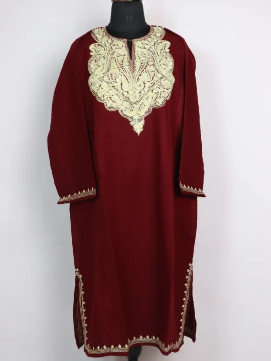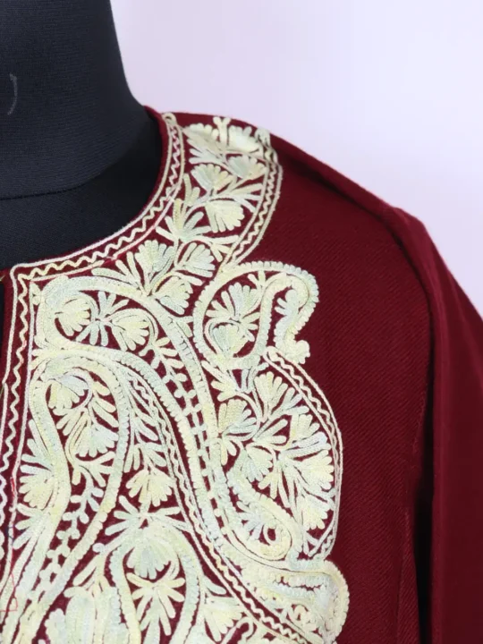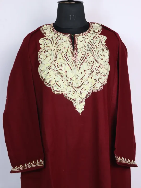 This maroon cashmilon wool pheran showcases intricate badam-style Aari embroidery in contrasting tones, giving it a refined and elegant charm. The pheran also includes two side pockets for everyday ease.