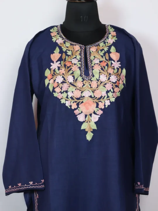 Green Ruby Cotton and floral Aari neckline embroidery create a composed indigo blue Kurta Set that reads both modest and refined. Chest size 44 and length 40 inches provide comfortable room while the Kurta Set keeps styling simple.