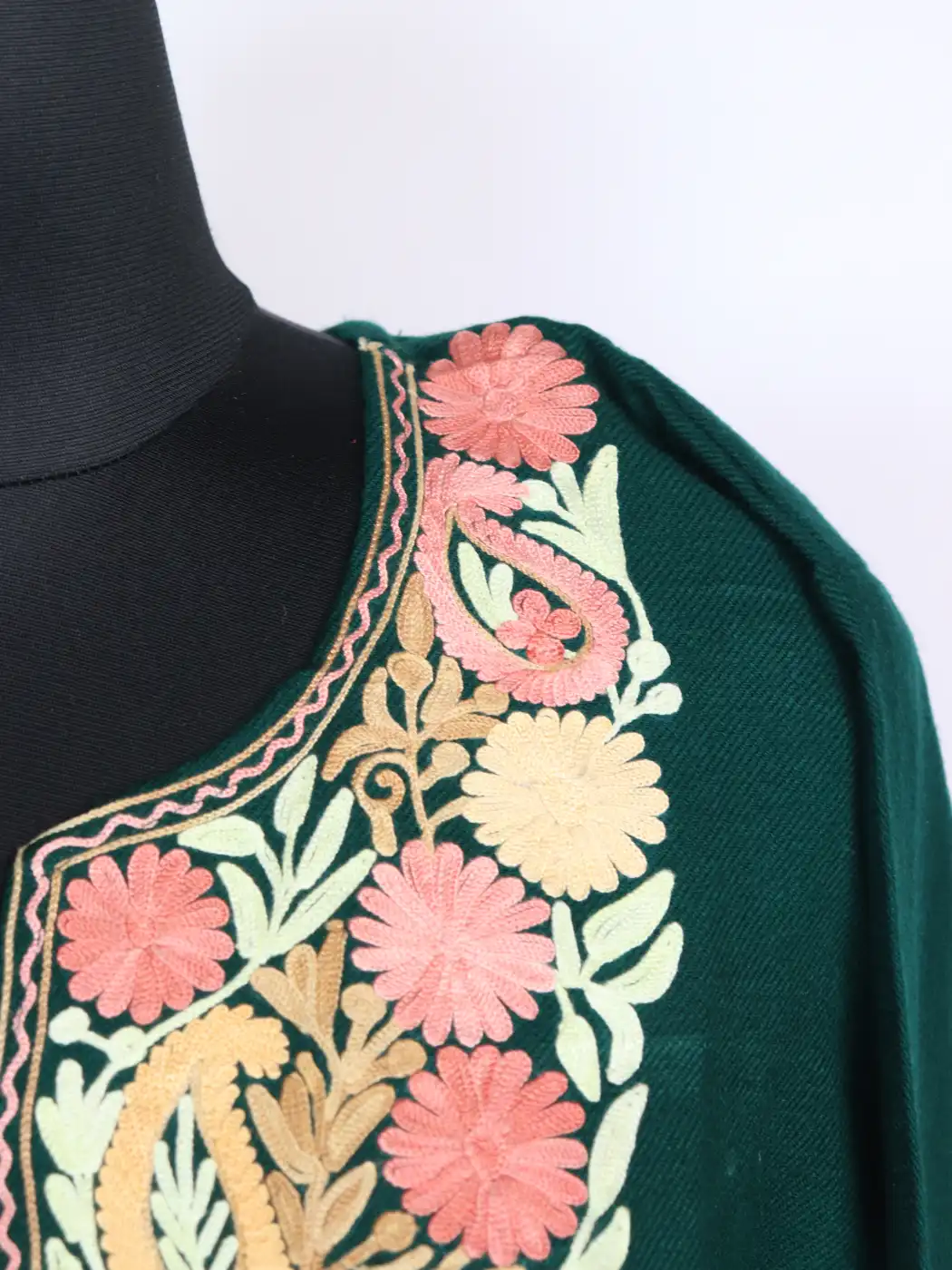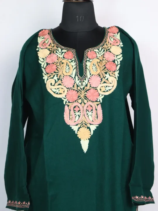 Cashmilon wool pheran, designed to keep you warm and stylish. It features aari embroidery at neckline in badam motifs. Perfect for both everyday wear and festive occasions, it also has two convenient side pockets