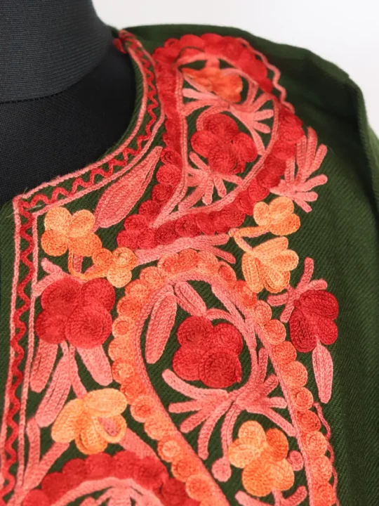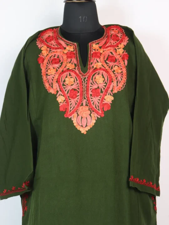 Soft dark green Cashmilon wool gives the mehnaz pheran a cozy feel, while the neckline has been adorned with badam Aari embroidery outlines with red and orange hue floral line. Its 43-inch length and 50-inches chest measurement ensure an easy fit for layering over winter outfits. It is ideal for casual and home wear, this pheran caters to those who are searching for a kashmiri aari work pheran, which balances comfort, style, and traditional charm.