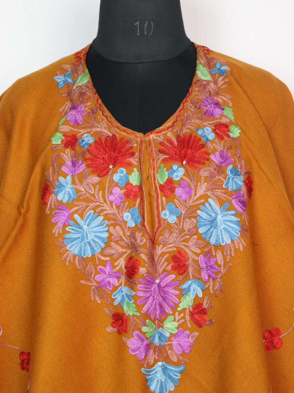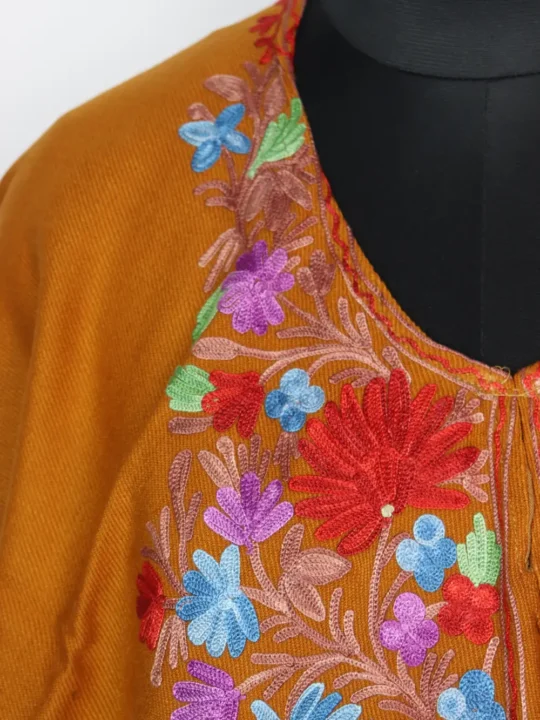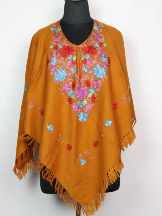 This Cashmilon wool poncho has nice floral Aari embroidery kadhai around the neckline with matching work near the border. It fits well on the shoulders and feels warm for winter days.