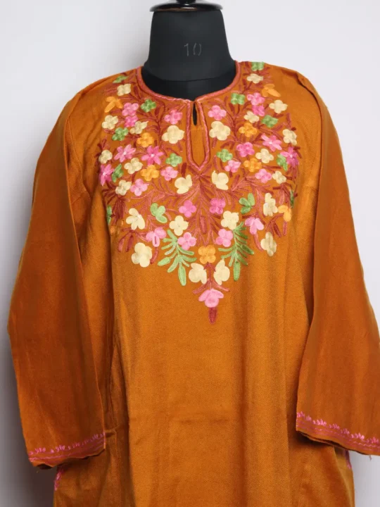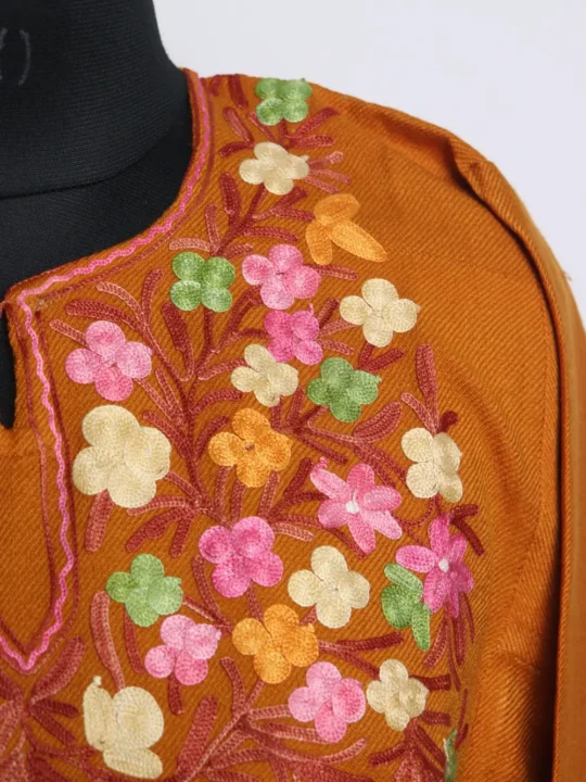 Orange Cashmilon Wool Pheran With Booti Aari Work Urwa