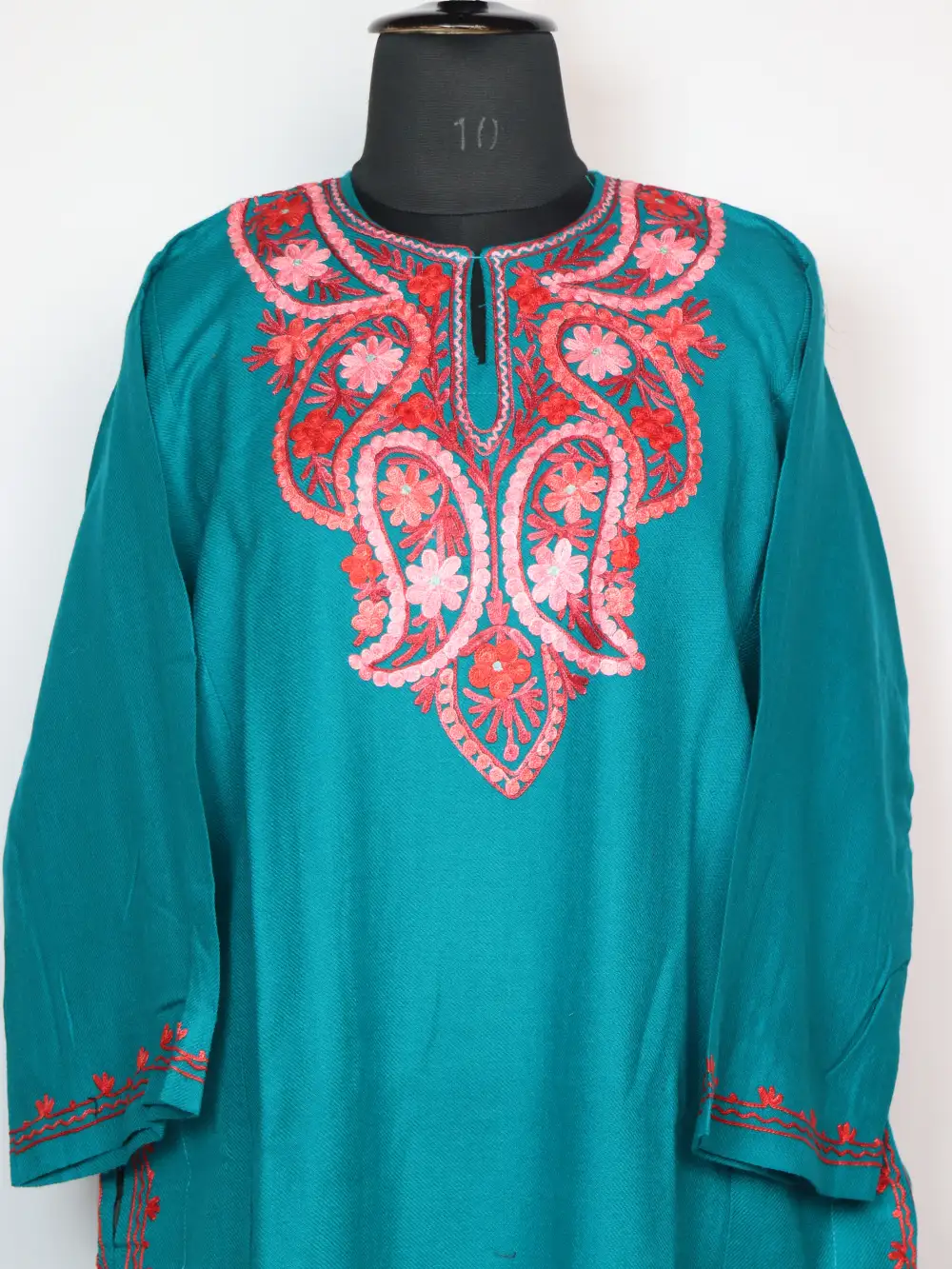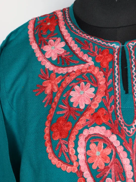 The soft cashmilon fabric combined with detailed badam Aari work with floral print in it, gives the feran modern yet traditional look.