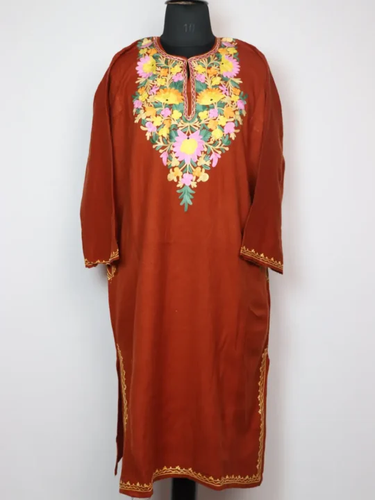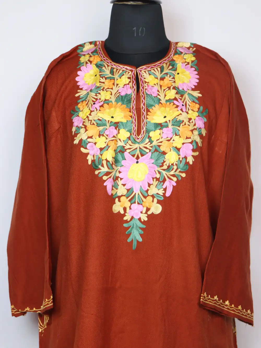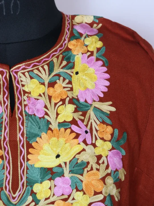 Floral embroidery detailing on the neckline and side panels adds graceful charm to this cashmilon wool Kashmiri pheran. It stays warm and comfortable on long winter days.