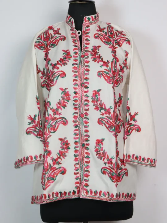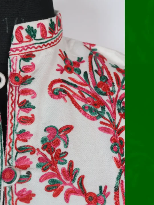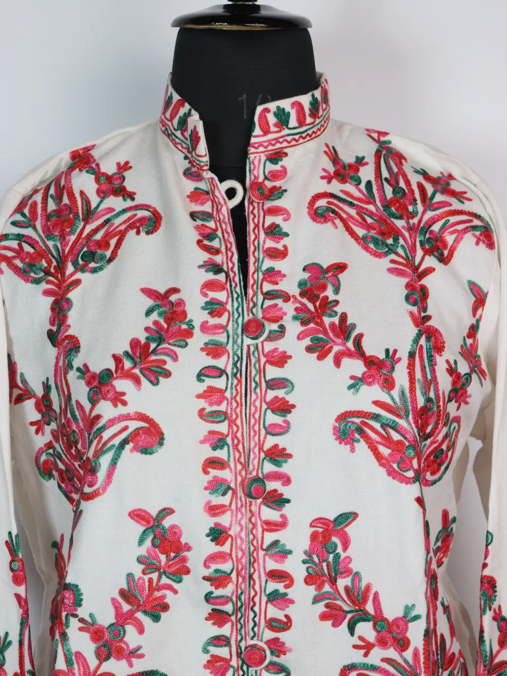 Soft white Cashmilon wool gives this Gulnar coat a cozy winter feel. Red and green badam floral aari motifs embroidered across the borders add delicate charm to it. Measuring 29 inches in length, this jacket drapes elegantly while providing warmth. It comes with lining for comfort, the coat balances style and practicality, which makes it a versatile piece for daily winter layering and effortless elegance.