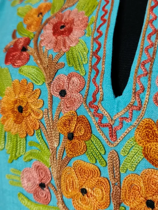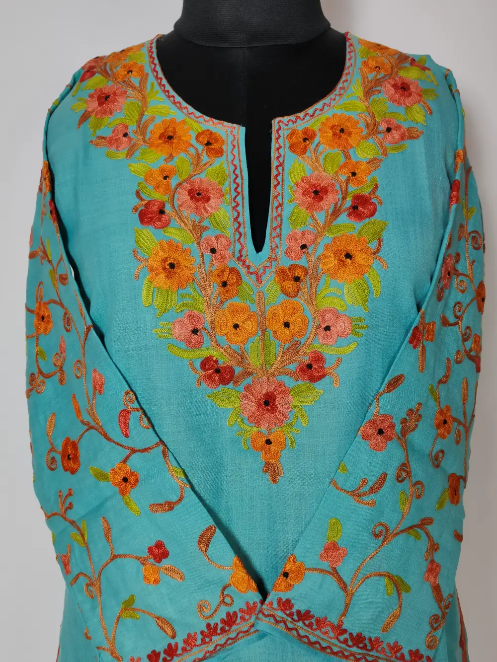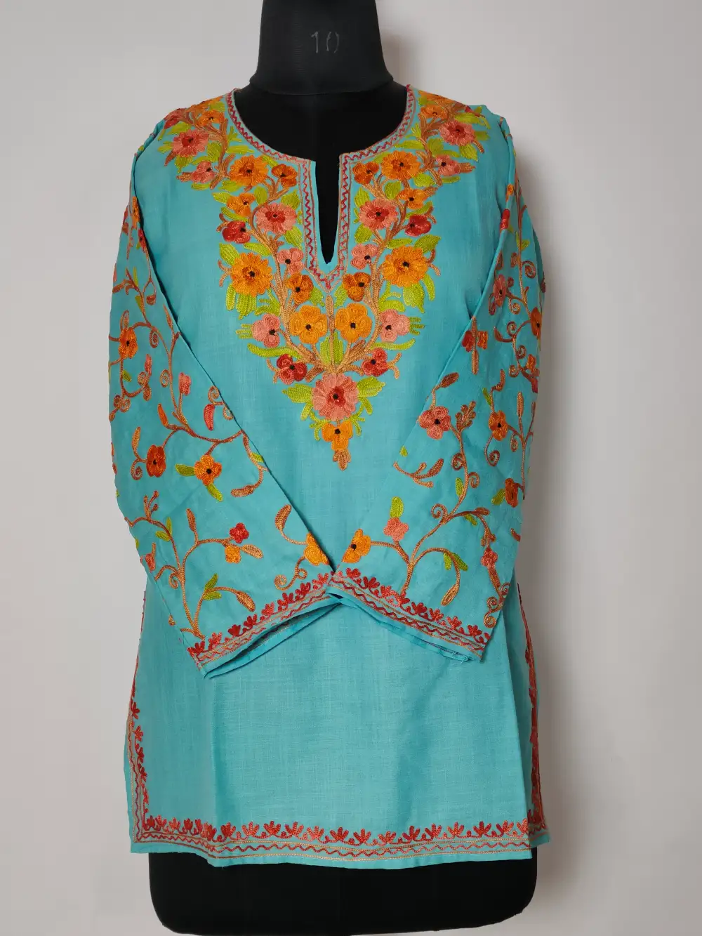 A breathable cotton kurti with floral Aari kadhai at the neckline and sleeves. Chest size is 39 inches with a 29 inch length, keeping it comfortable for regular wear.