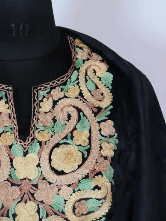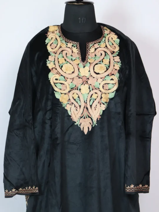 Warm velvet and Aari kadhai frame this black Kashmiri pheran with badam motif embroidery at the neckline; you can buy phiran this online to reserve it.