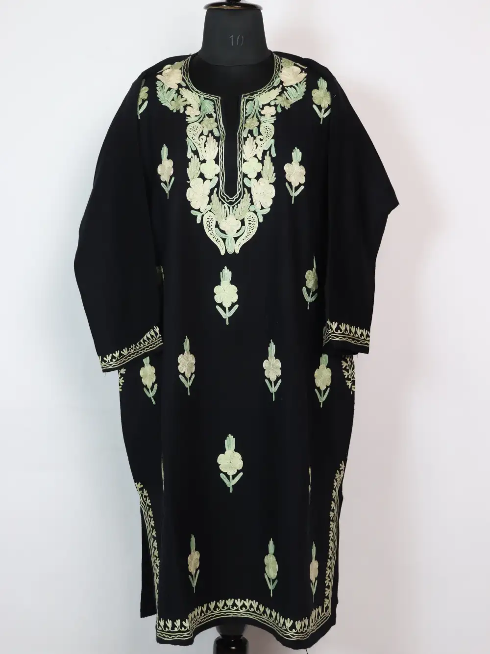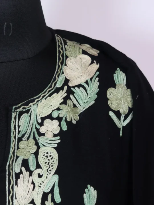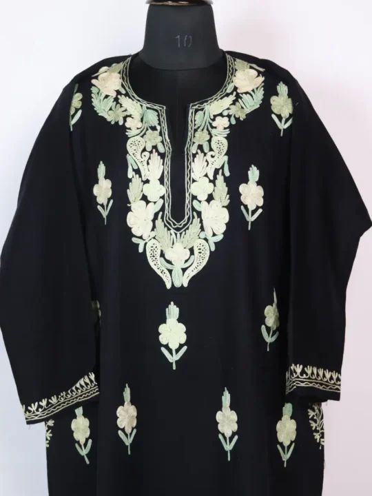 Floral Aari embroidery at the neckline and booti style front panel in light green shaded threads adds a calm accent to this black cashmilon wool Kashmiri feran, it is sized 52 inch chest and 42.5 inch length. This feran layered winter outfits and pairs naturally with everyday trousers and shawls. For easy purchase, you can order this pheran online at 1799 and bring a refined Kashmiri charm to your wardrobe.