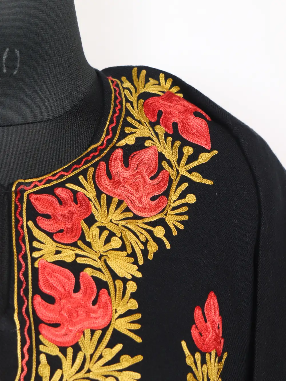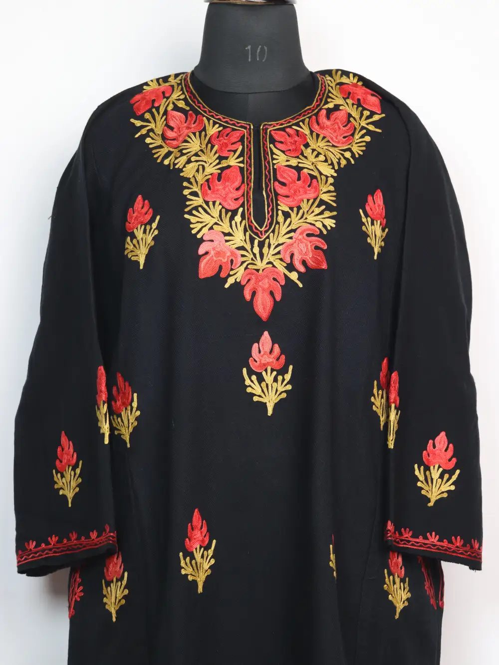 A calm phiran kashmir in black colour Cashmilon Wool wears chinar Aari at the neckline and booti style work done all over it. Its chest size 52 inches and length 43 inches give a comfortable, flowing fit.