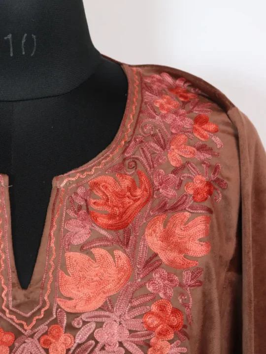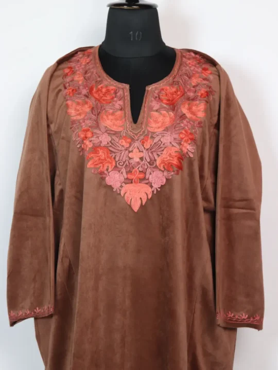 This brown velvet pheran showcases chinar and floral Aari kaam concentrated at the neckline and it comes in 50 inches chest size and 42 inches length, that gives a subtle Kashmiri accent.