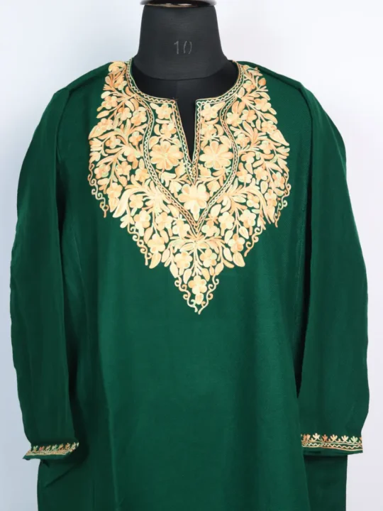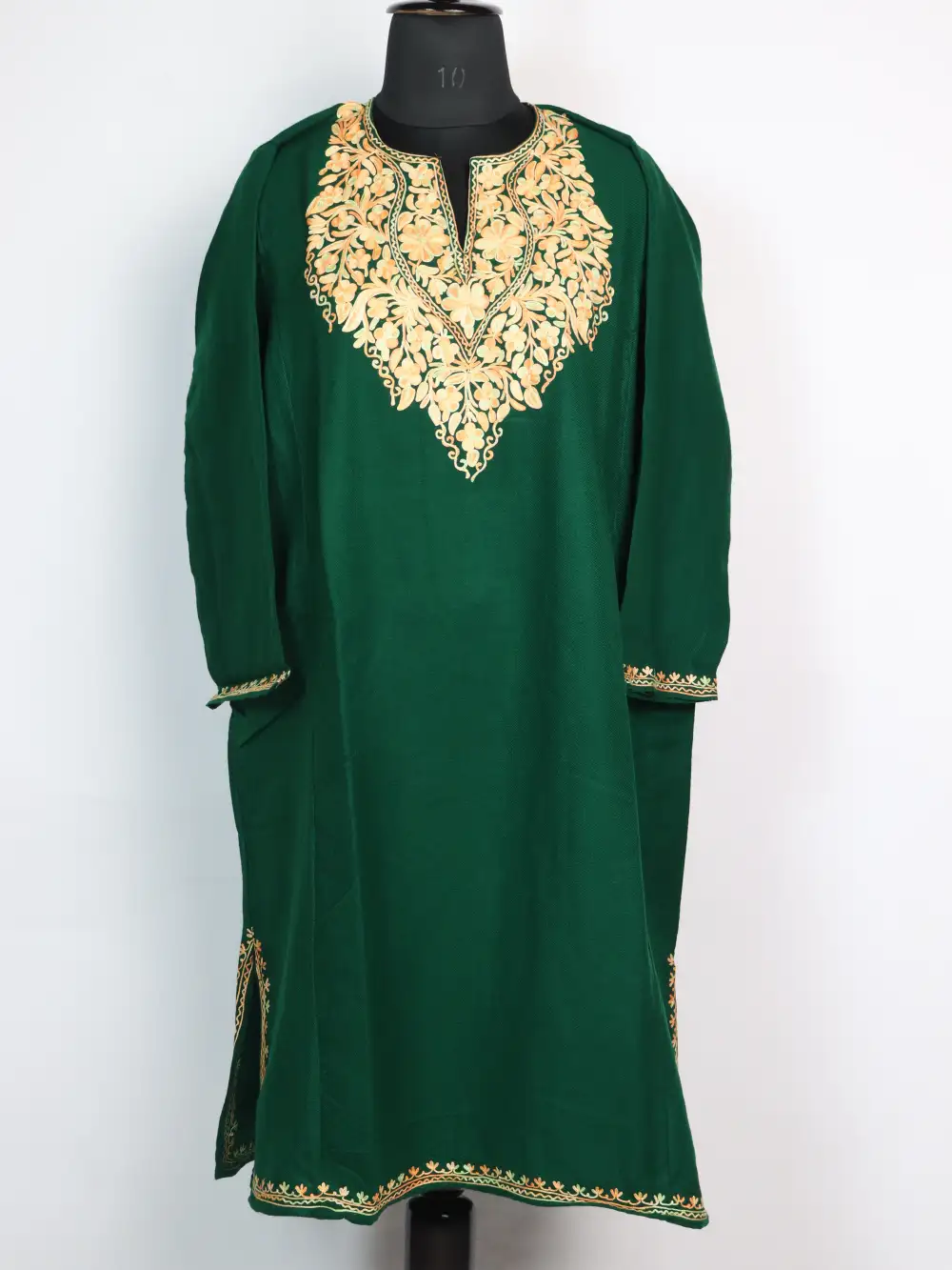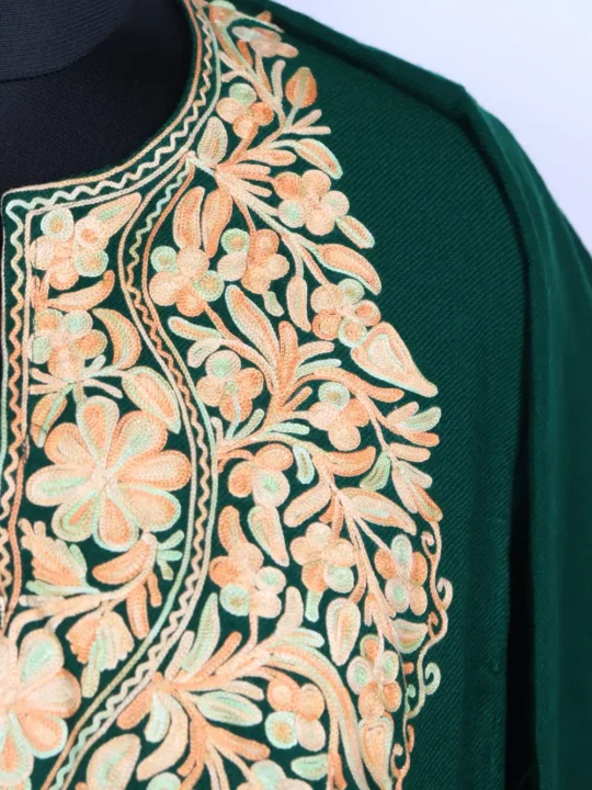 This elegant green Cashmilon wool pheran features a beautiful floral Aari design adding a touch of traditional Kashmiri charm. It has a chest size of 52 inches and a length of 41 inches.