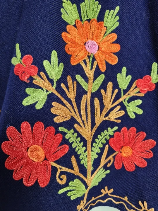 The Pheran, made in Cashmilon wool, brings a soft touch of winter coziness for 2-3-year-old girls. Floral Aari work decorates the neckline and front panel in red and green and mustard hues, blending beautifully with its dark blue tone. It is designed with a 28-inch chest and 22-inch length. The Pheran balances comfort and elegance and remains a graceful choice among pheran from Kashmir for kids.