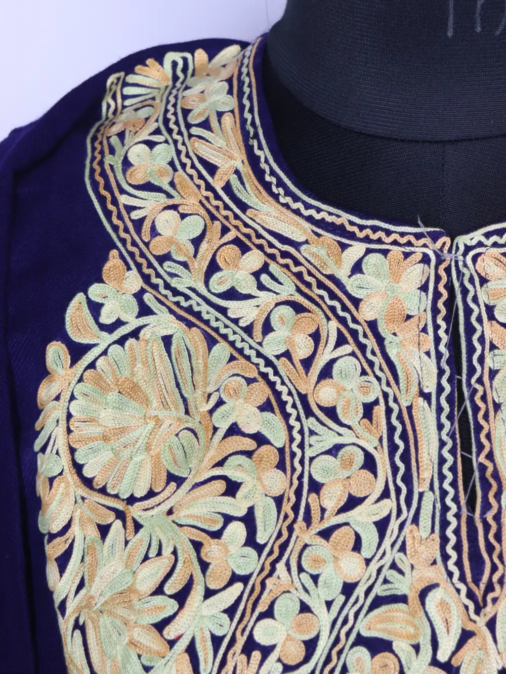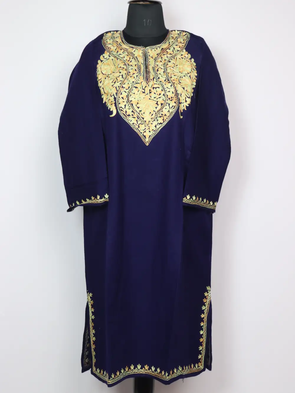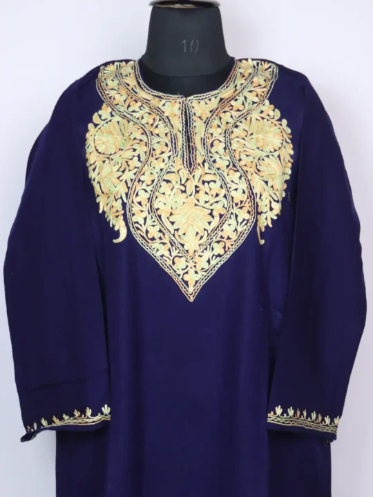 This rekhta pheran is made in fine cashmilon wool and has detailed floral aari embroidery all around the neckline. The 46 inch chest with 43.5 inch gives it an easy, relaxed fall.