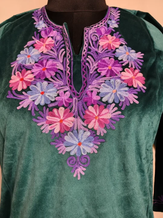 For your little one’s winter wardrobe, this velvet Pheran Set brings together comfort and artistry. Floral Aari kaam in pink-purple threads lights up the neckline, while the soft dark green fabric keeps it cozy. Sized at 42-inch chest and 32.5-inch length, with a matching trouser, it’s perfect for 8-9-year-old girls. It is a timeless favorite among kids Kashmiri Phiran outfits