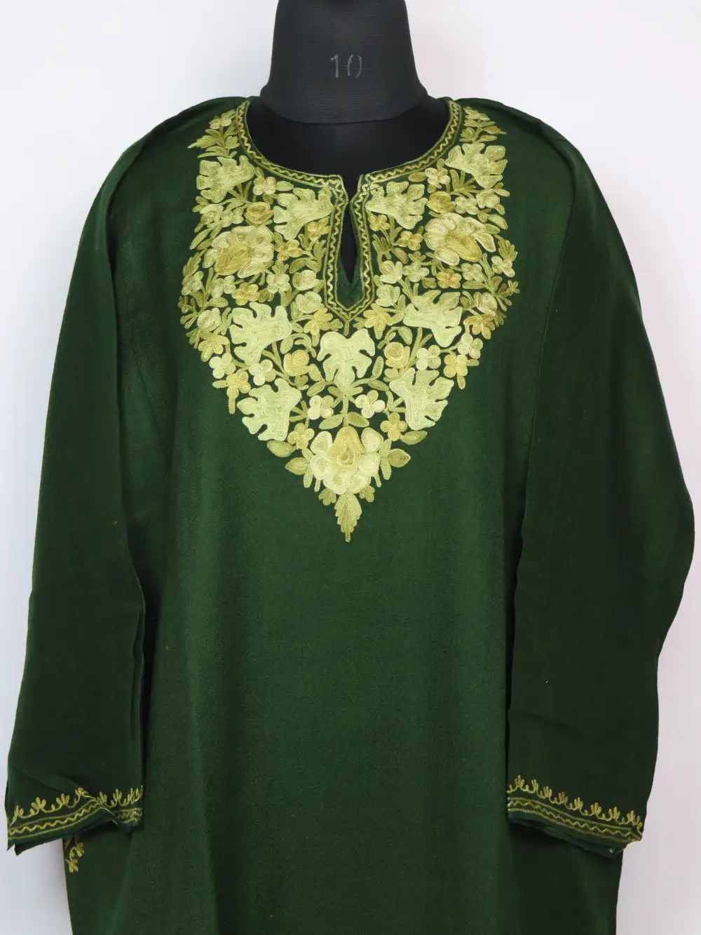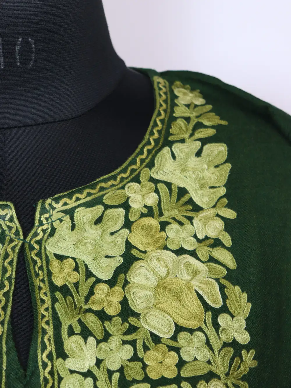 Raffal Wool and floral and chinar Aari neckline give this green Kashmiri phiran a composed character, it comes with chest size 50 inches and length 43 inches that makes it a roomy, comfortable layer.