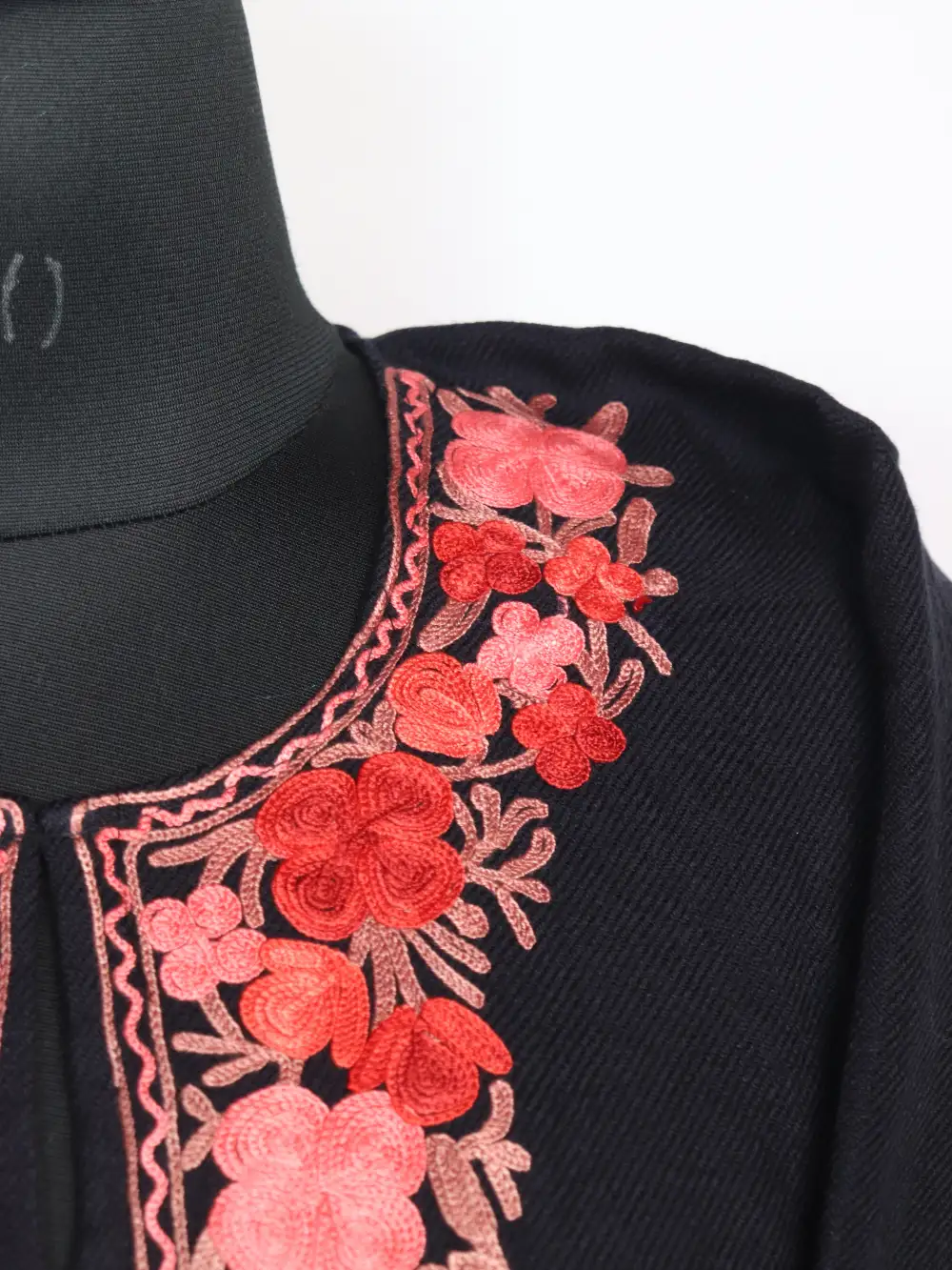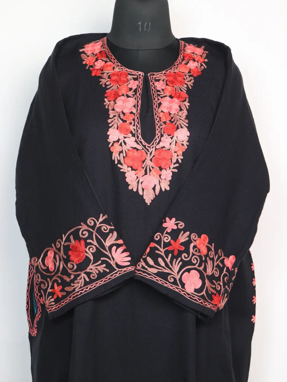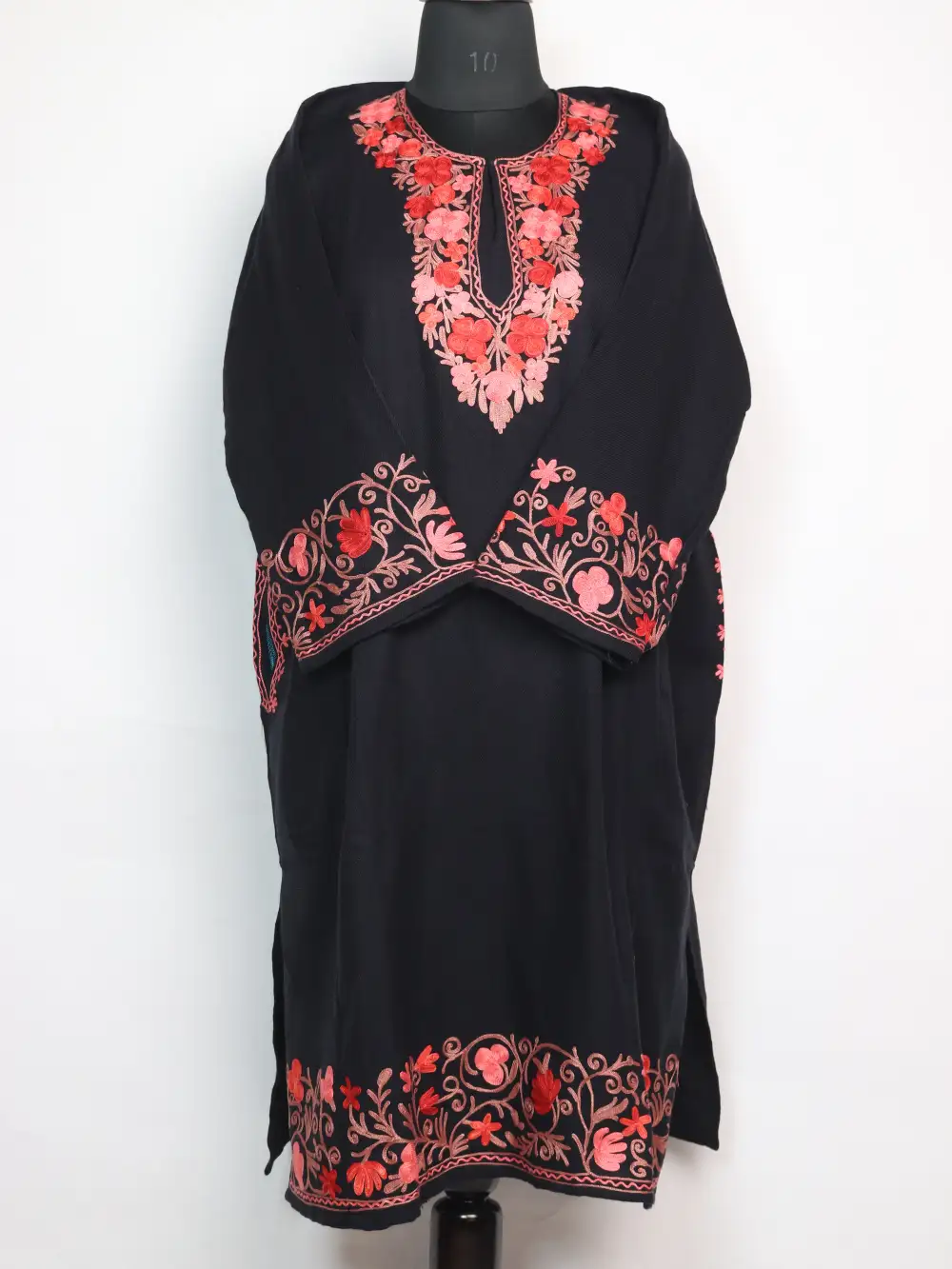 A relaxed phiran dress in black hue Cashmilon Wool wears floral Aari at the neckline and it includes pockets on both sides, which make this phiran dress practical for daily life.