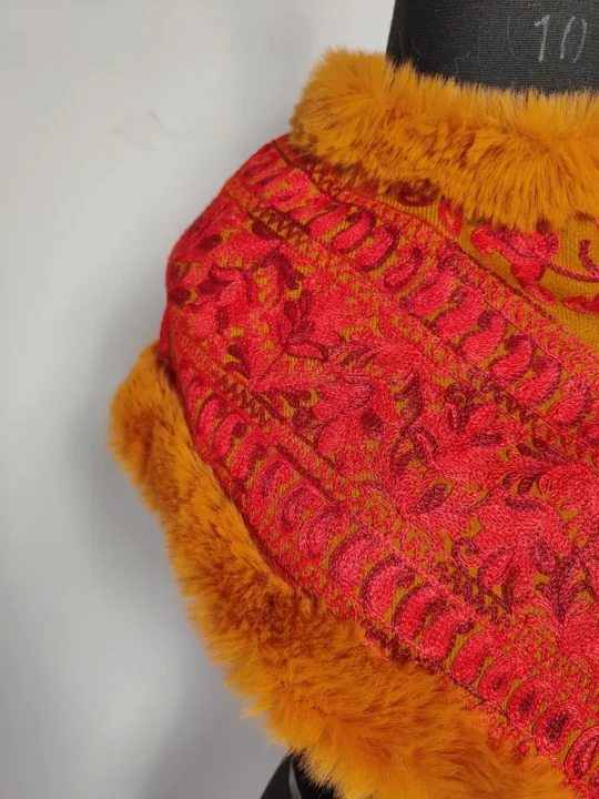 Mustard Cashmilon Wool forms the body of this kids Fur Poncho, richly decorated in Aari with red-hued floral and badam motifs all over it. Tailored for girls with a 22-inch chest and 14-inch length, it keeps movement easy and cosy. The craftsman’s Aari kadhai adds a homely stitch appeal to the poncho. This fur Poncho pairs warmth and pretty design and it is a favourite listed under kashmiri poncho dress items.