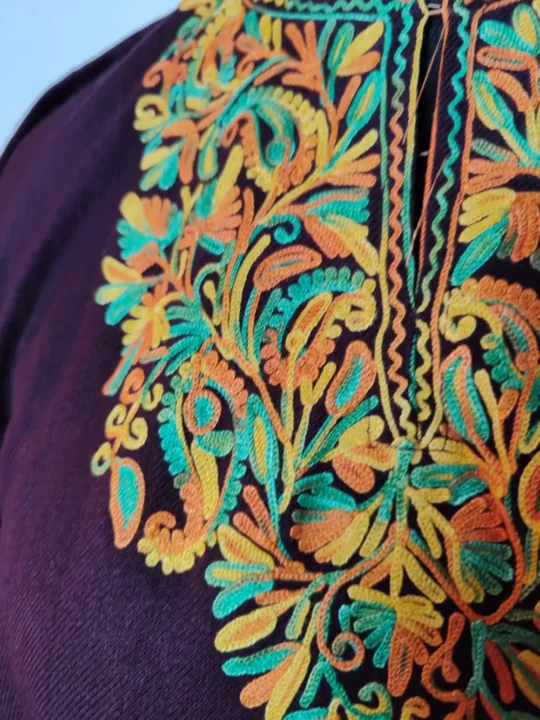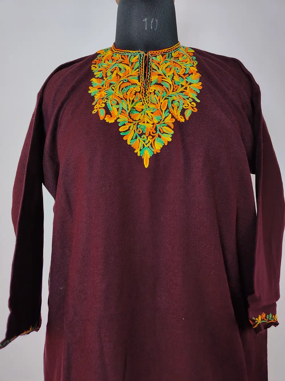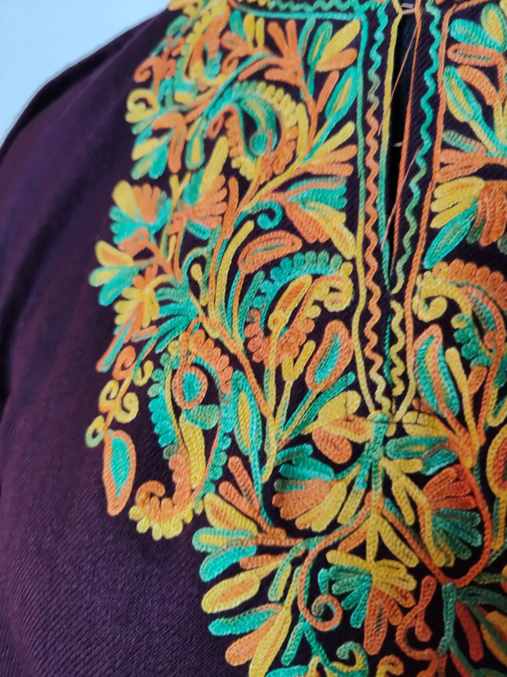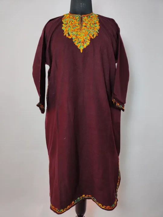 It is being offered at ₹1299, it’s a budget-friendly addition to your winter wear, blending classic embroidery with everyday comfort. Simple, soft, and warm — this maroon pheran in Cashmilon wool fabric is styled with floral orange, yellow and green Aari embroidery around the neckline. Its 44-inch chest size keeps it versatile for all body types.