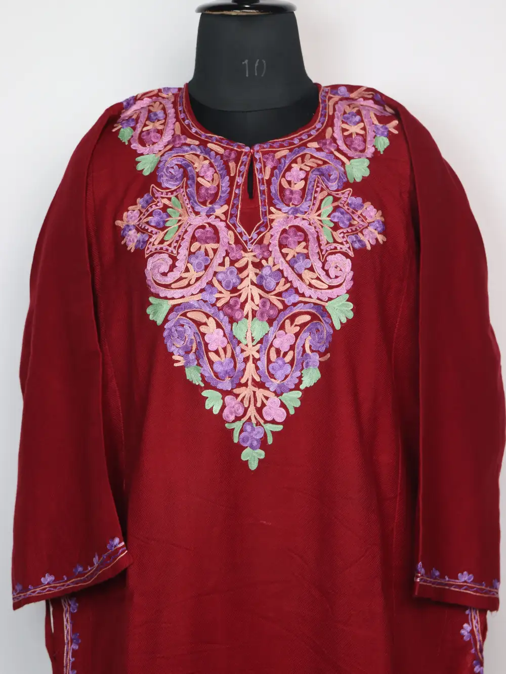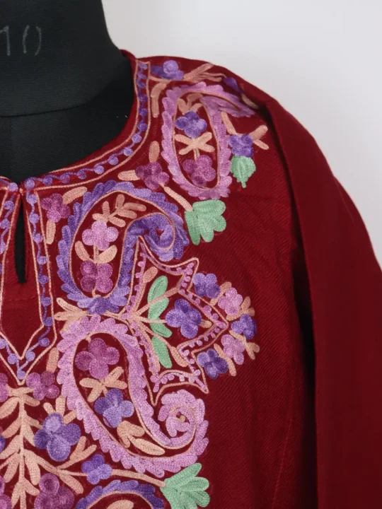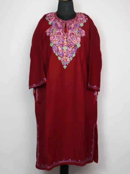 Made in cashmilon, this pheran carries clean badam aari motifs detailing around the neck. The 50 inch chest with 46 inch length gives it a relaxed fit. It falls nicely without feeling heavy.