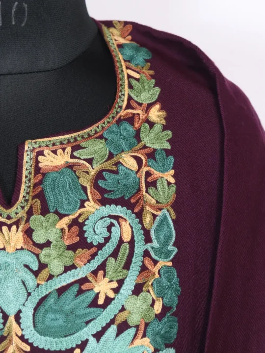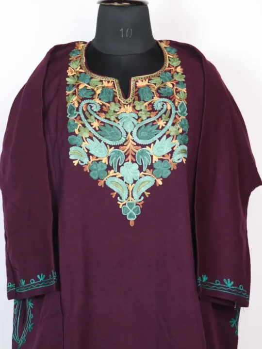 A refined purple Pheran in Cashmilon Wool with badam motif embroidery done at neckline. It comes in 56 inch chest size and 43 length that makes it comfortable and easy to wear.